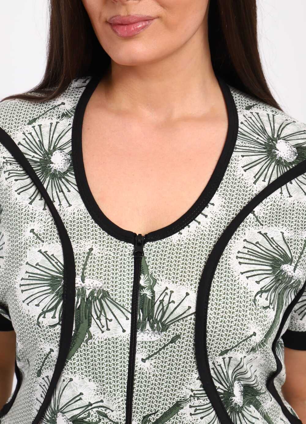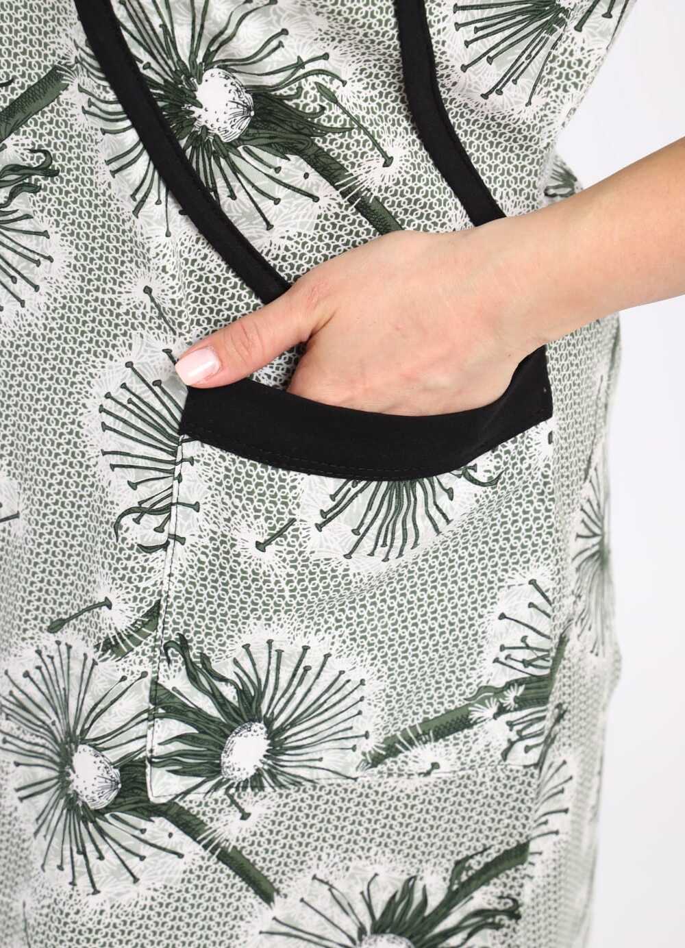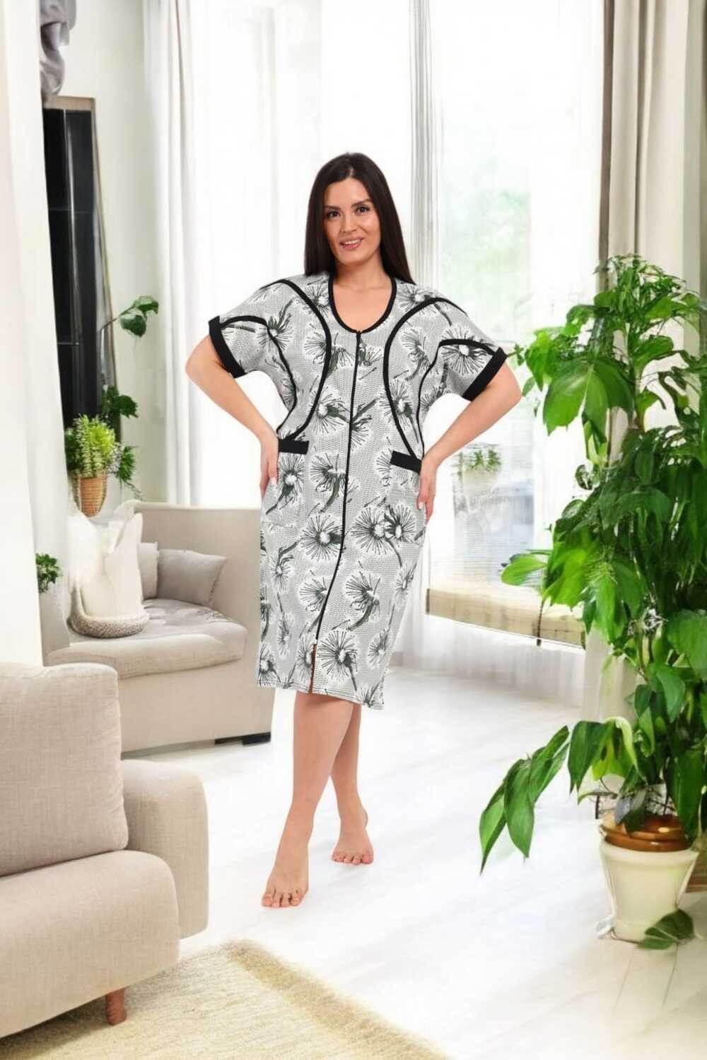 В удобном домашнем халате на молнии с короткими рукавами и длиной до колен. Халат выполнен в светлых тонах с изящным цветочным принтом и дополнен контрастной черной окантовкой, придающей ему стильный вид. Функциональные карманы спереди делают модель практичной для повседневного ношения. Цвет: бело-зеленый; Материал: кулирка;кулирка; Состав: 100% хлопок.