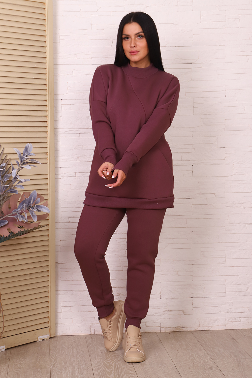 Костюм из футера 3-х нитки с начесом. Толстовка без капюшона, с карманами, рукав спущенный. Брюки прямые без карманов, пояс и манжеты из кашкорсе