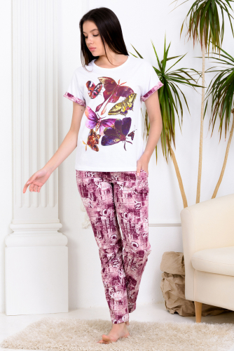 Костюм состоит из толстовки и брюк. Брюки на поясе, с боковыми карманами, на манжете по низу. Толстовка прямая, свободная, с удлиненной спинкой, с капюшоном, с длинным рукавом на манжете. Низ полочки собран на шнур-стяжку. В нижней части боковых швов обработаны разрезы.