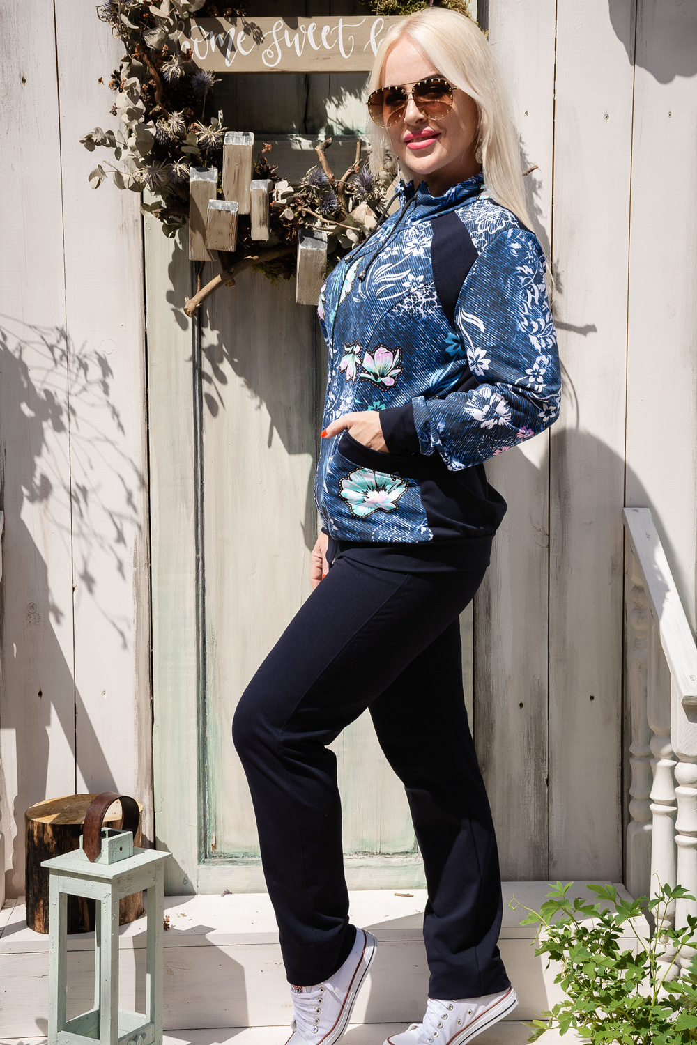 Костюм из футера с лайкрой толстовка + брюки. Толстовка на молнии, дизайн в виде цветов, темные вставки, отделка и манжеты, по бокам карманы. Темные однотонные брюки, длина до щиколоток