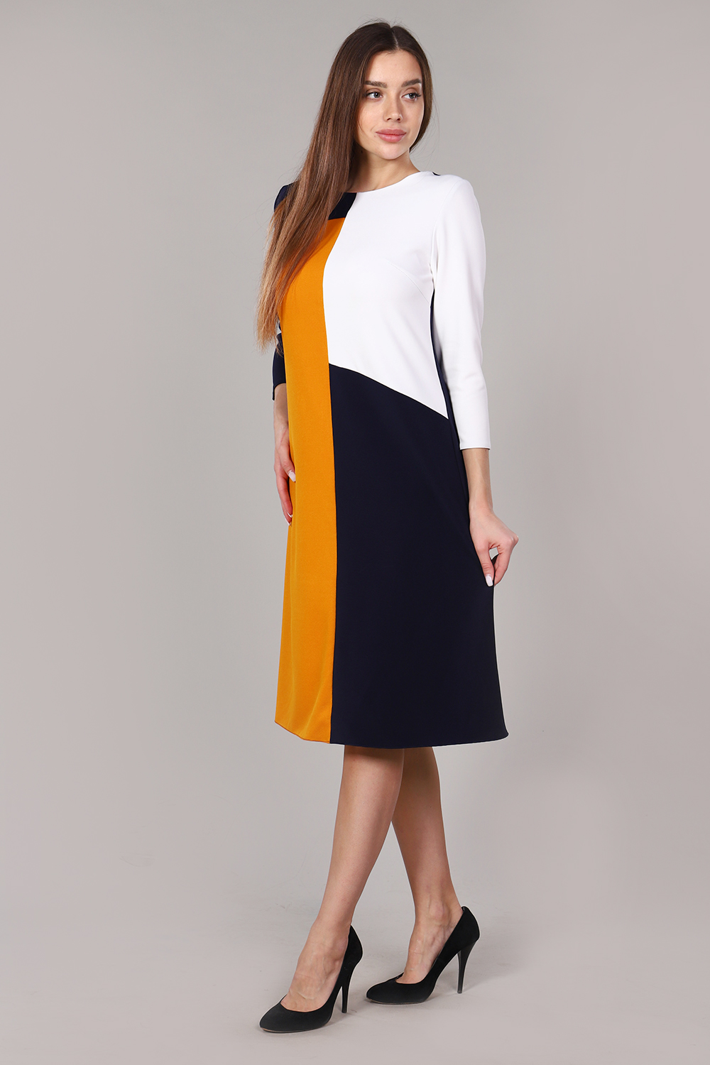 Платье приталенного силуэта. Юбка расширена к низу. Рукав 3/4. Горловина обработана обтачкой. Платье выполнено из тканей 3-х цветов.