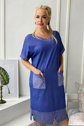 Платье женское прямого силуэта. Рукав цельнокроенный короткий. Середина горловины полочки и низ рукава слегка собран на декоративную серебряную тесьму. От линии талии по центру полочки встречная складка. Без карманов