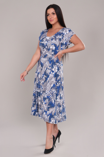 Платье женское прямого силуэта. Рукав цельнокроенный со швом. Верхняя часть полочки и манжета рукава из отделочной ткани в полоску. В верхней части полочки накладные карманы и имитация планки, в нижней: встречные складки, обеспечивающие дополнительную свободу в области талии и бедер. На модели 52 размер