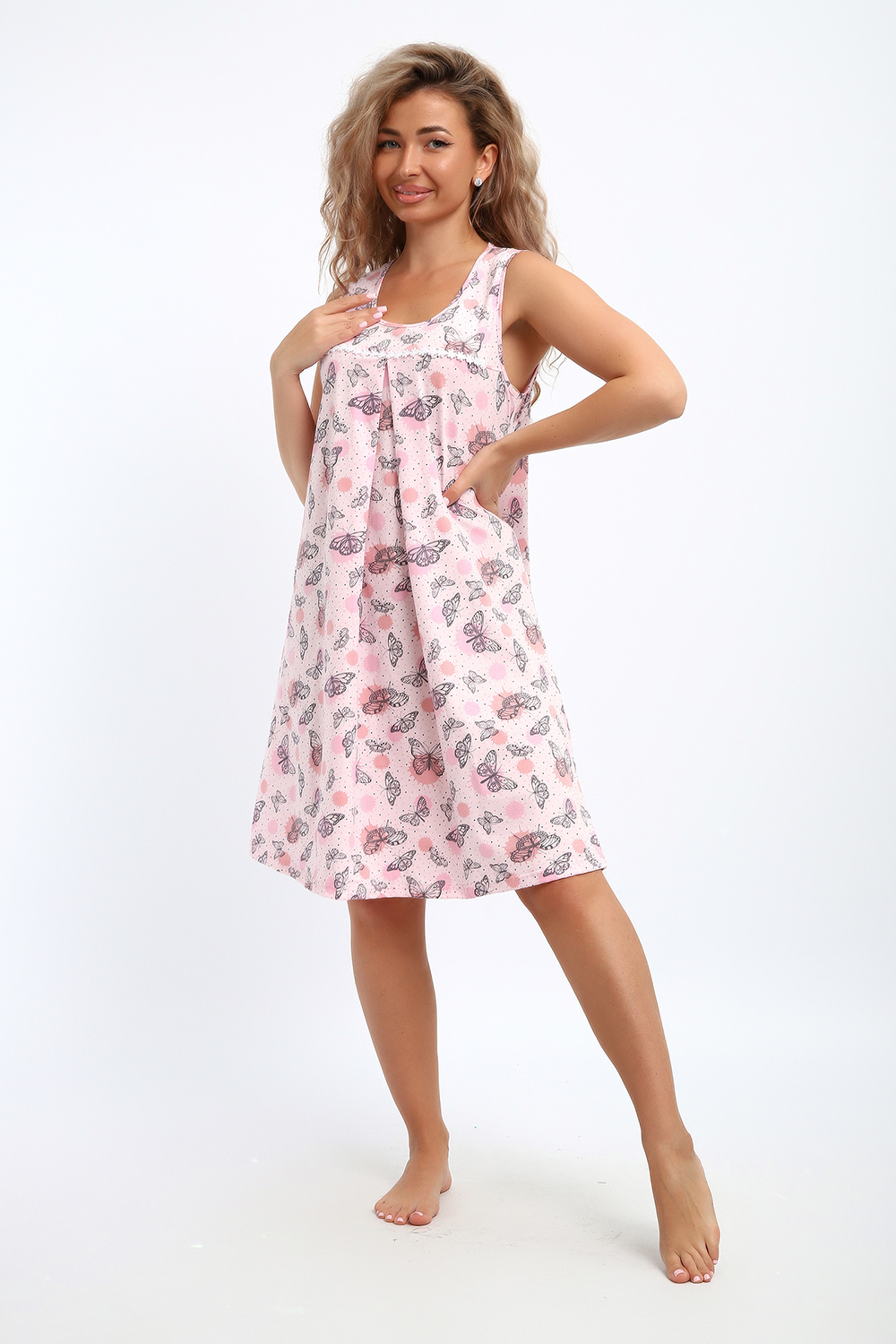 Сорочка свободного покроя маечyого фасона с кокеткой. По кокетке нашиты ромашки. Подходит для беременных. Цвет: бабочки; Материал: кулирка;кулирка; Состав: хлопок 100%.