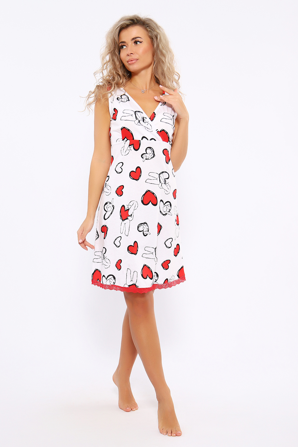 Сорочка женская с V-оборазным вырезом, без рукава с запахом. Данная модель выполнена из трикотажного полотна кулирка (хлопок 100%). Горловина и пройма обработана окантовкой из основной ткани. Низ изделия украшен эластичным кружевом. Подходит для кормления малыша. Цвет: белый; Материал: кулирка;кулирка; Состав: хлопок 100%.