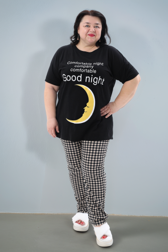 Пижама женская с шортами их натурального трикотажа. Хлопок 100% Майка с подрезом по линии груди и четырьмя защипами. По центру лифа два декоративных банта. Спинка отделана кружевом. Вырез горловины, пройма и бретели выполнены из окантовки. Силуэт чуть расклёшенный к низу. Низ топа прямой по форме и обработан швом в подгибку. Шорты прямые, короткие, без бокового шва и карман. Низ шорт украшен кружевом. Пояс цельнокроеный, на резинке.