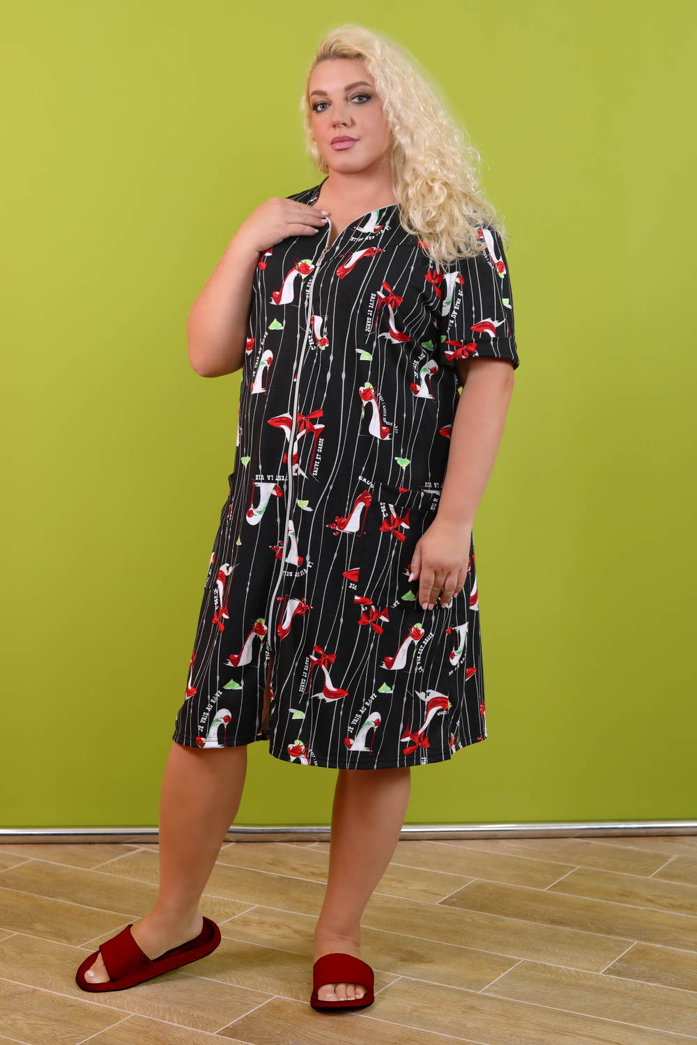 Халат женский на молнии с коротким рукавом. Данная модель выполнена из трикотажного полотна кулирка (хлопок 100%). Горловина фигурная со стойкой, на полочке по бокам присутствуют накладные карманы. На рукавах пришиты манжеты. Отличная модель порадует вас своей изящностью и комфортом.