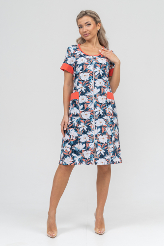 Женский халатик на молнии самая распространенная и универсальная одежда для домашнего отдыха и хозяйственных хлопот. После трудного рабочего дня, приходя домой, первым делом хочется переодеться. И данная модель это идеальный вариант среди представительниц прекрасной половины человечества. Модель выполнена из 100% хлопчатобумажной ткани. Халат так же дополняет яркая отделка по рукавам и карманам. А пояс на линии талии поможет легко смоделировать женственный силуэт и при этом Вы будете чувствовать себя легко и непринуждённо. Данная модель прекрасно подойдёт для дома, дачи и отдыха, создавая по-настоящему яркий образ и хорошее настроение!