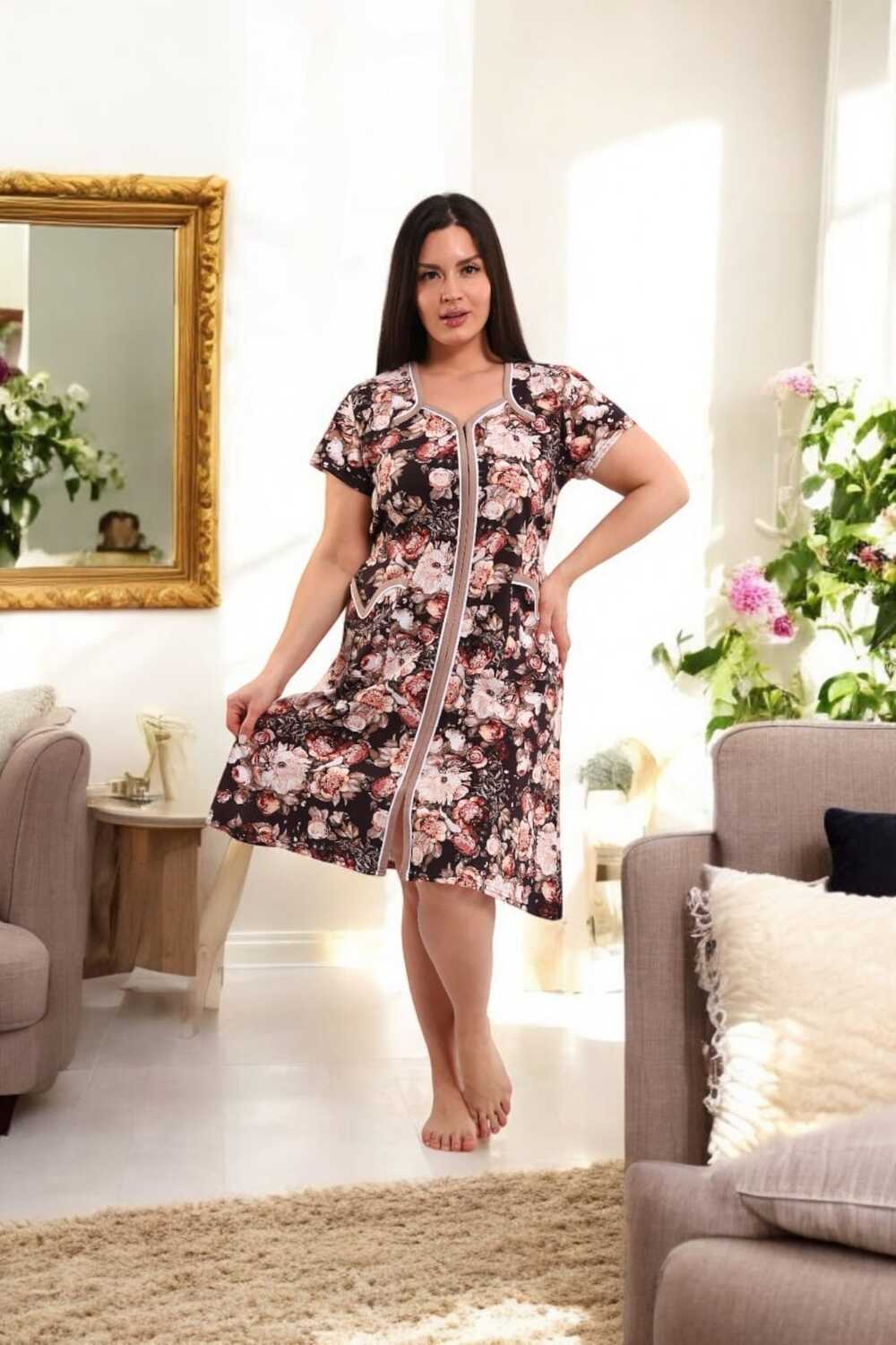 Элегантный и комфортный халат, выполненный из мягкого, дышащего трикотажа. Модель средней длины с короткими рукавами и удобной застёжкой на молнии по всей длине. Изысканный цветочный принт в розово-бежевых тонах на тёмно-коричневом фоне придаёт образу женственность и уют. Прямой силуэт с лёгкой приталенностью за счёт завязки на талии сзади. Короткие рукава, удобные для повседневного ношения. Два глубоких накладных кармана с контрастной отделкой, окантовка горловины, рукавов и карманов белой и бежевой бейкой.