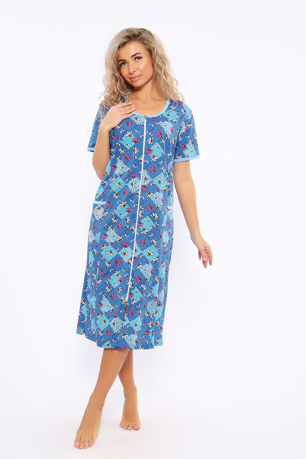 Халат женский на молнии. Изготовлен из натуральной хлопковой кулирки. Удлиненный, с рельефами по полочке, с боковыми карманами, кант по горловине, рукавам и карманам.