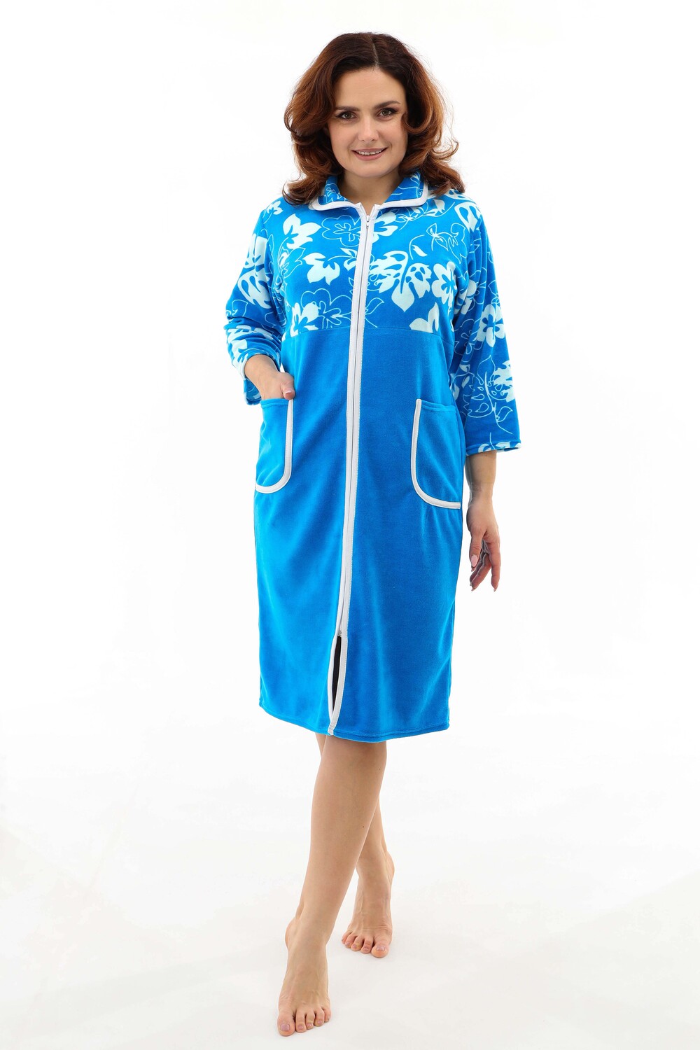 Халат женский на молнии, воротник круглый, в боковых швах два полупояса, рукав длиной до локтя. В наличии есть большие размеры. Ткань велюр.