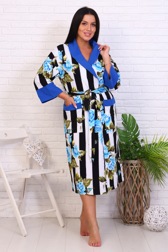 Халат велюровый на молнии декор. Горловина халата с V-вырезом, на модели имеются карманы и рукав 3/4. Хорошая длина, к низу небольшая расклешенность. Качество ткани отличное, не деформируется, не линяет. Уютно, удобно и комфортно. Для дома и отдыха.