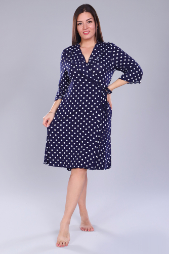 Халат из вискозы на запах, рукав чуть расклешенный 3\4,длина до колена, по груди рюши. Очень приятный к телу.