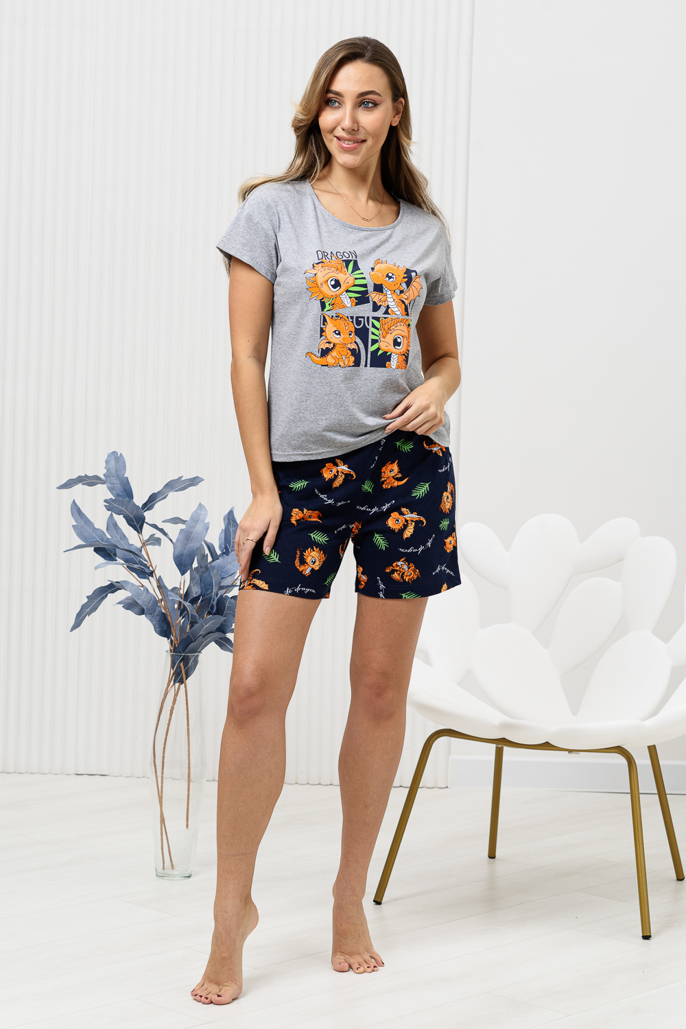 Удобная и очень комфортная пижама с новогодней символикой. Футболка из кулирной ткани - меланж украшена ярким принтом с изображением очаровательных дракончиков - символом 2024 года. Рукав короткий, спущенная пройма, горловина обработана окантовкой и отстрочена, что придаёт изделию аккуратный и стильный вид. Шорты домашнего комплекта выполнены из полотна с рисунком, перекликающимся с принтом на футболке, имеют карманы. Комплект подойдёт как домашний костюм, и как изделие для сна, будет отличным подарком для ваших близких.