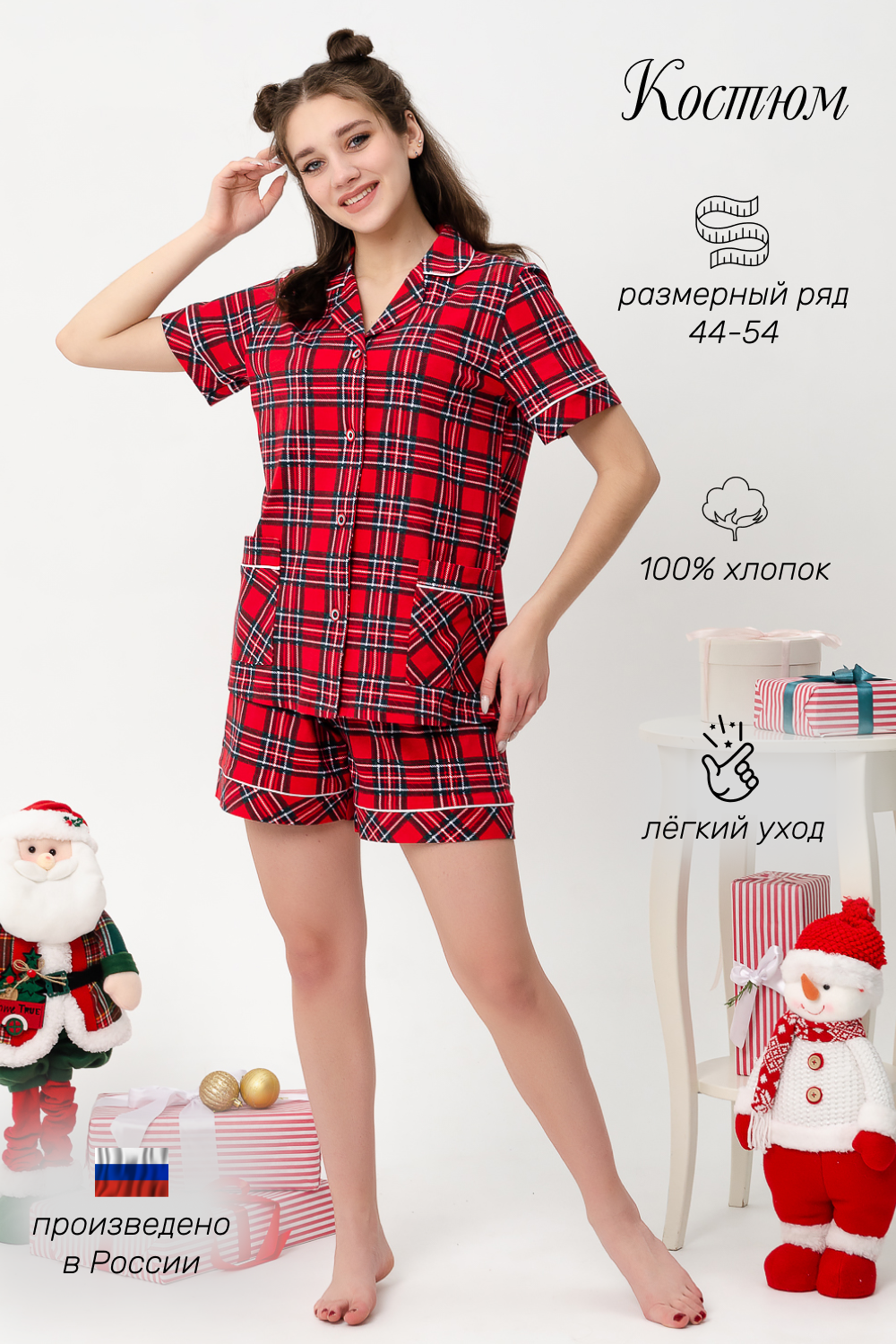 Пижамный костюм из 100% хлопка, состоит из рубашки и шорт. Рубашка на пуговицах с декоративной отделкой. Шорты прямые верх на поясе с резинкой, декоративный бантик на поясе. Трикотажное полотно, из которого выполнена пижама, не стеснит ваших движений и позволит вашей коже дышать. Данная модель отлично подойдет не только для сна, но и в качестве стильного домашнего костюма.