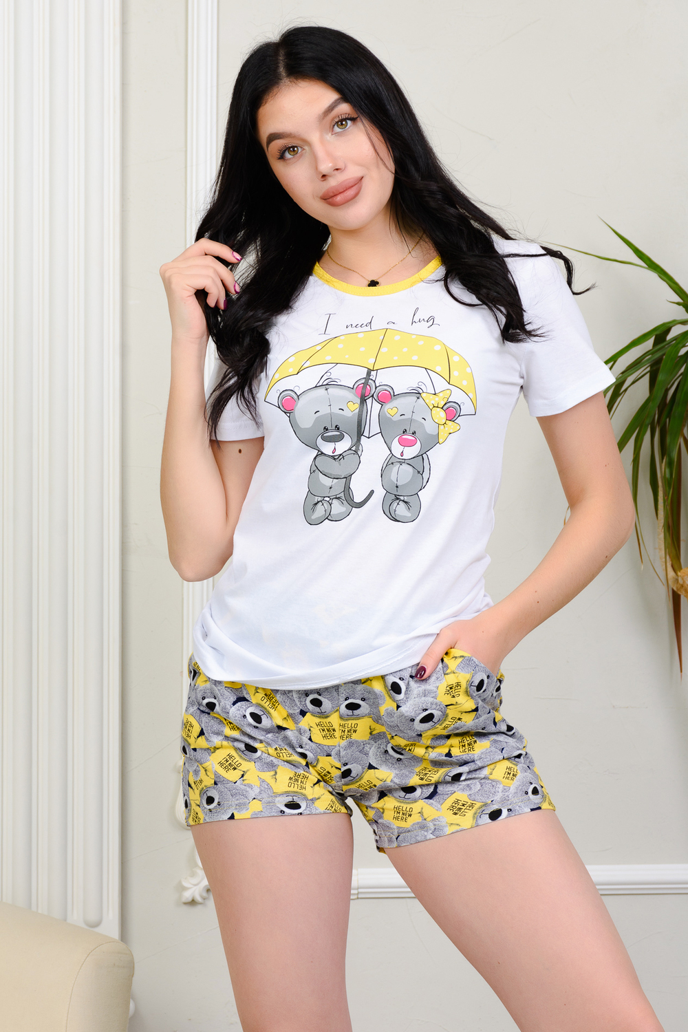 Пижама с шортами на каждый день. Свободные шортики с карманами, на талии заложены по две мягкие складки с каждой стороны. Футболка из мягкого трикотажа, милый мимишный принт