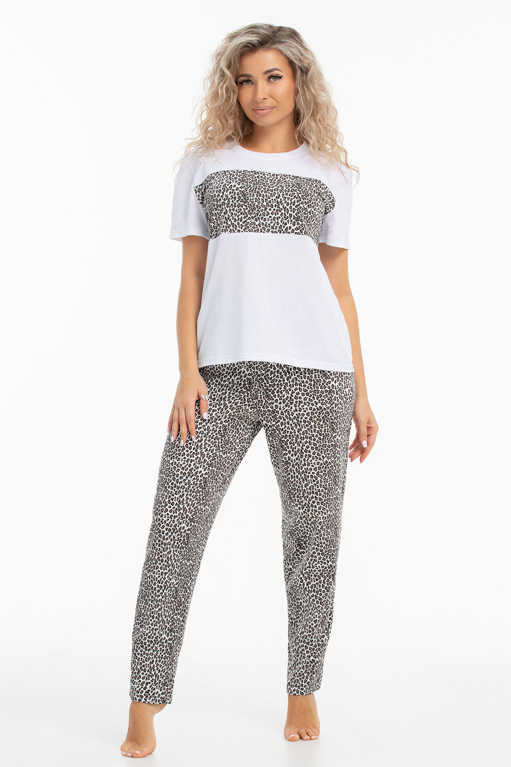Женская пижама состоит из футболки и брюк. Футболка изготовлена из трикотажного полотна пике, имеет свободный крой и достигает середины бедер. Рукав втачной, короткий. Брюки имеют длину 7/8, свободно сидят в бедрах и сужаются к низу. Модель оснащена боковыми внутренними карманами с округлым входом, а пояс выполнен на резинке.