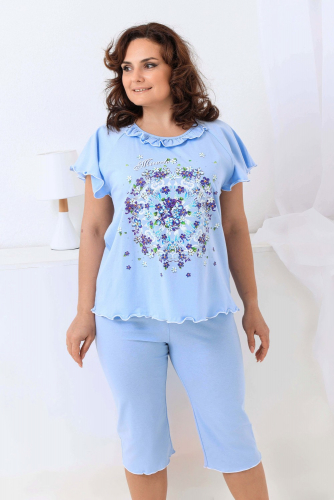 Пижама женская Весенняя: бриджи и базовая футболка, нежный очаровательный цветочный принт и крупный принт на полочке футболки создают романтичное настроение. Комфортно носить и спать - 100% хлопок.