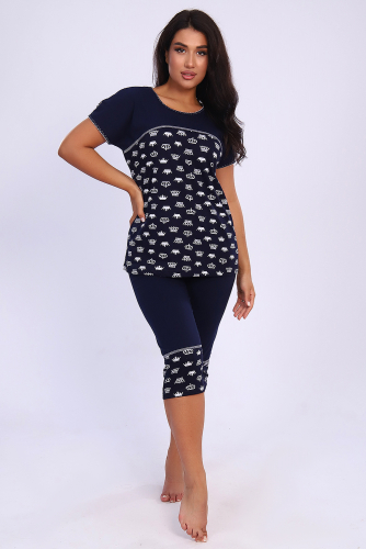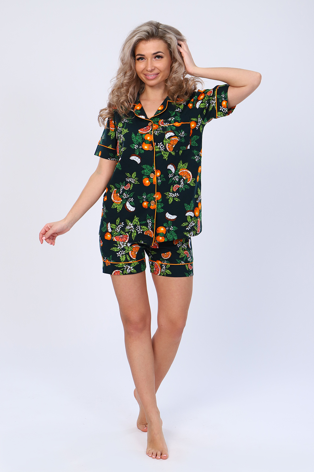 Пижама с ярким тропическим принтом, состоящий из кофты с коротким рукавом и шорт. Кофта застегивается на пуговицы, имеет красивый отложной воротник, на груди слева накладной карман, на рукавах манжеты, обработанные ярким атласным кантом. Шорты без карманов на мягкой резинке с удобной посадкой, снизу манжета, обработанная кантом. Пижама не стесняет движений, ткань мягкая, приятная к телу. Благодаря натуральному составу ткани в ней будет комфортно и удобно провести весь день, а ночью станет гарантией спокойного и крепкого сна.