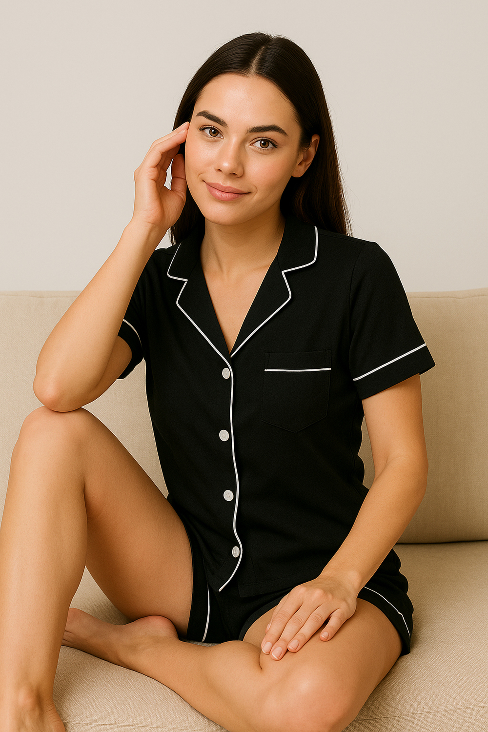 Женская пижама с шортами выполнена из мягкого и нежного хлопкового трикотажа кулирная гладь. Черная пижамка идеальна на каждый день. Натуральный 100% хлопок не электризуется и хорошо пропускает воздух. Рубашка с коротким рукавом имеет застежку на пуговицы. Рубашка прямого кроя не стесняет движения, а свободные шорты сделают ваш сон и домашний досуг максимально комфортными. В пижамке для женщин вы будете чувствовать себя очень свободно и уютно дома, на даче или на отдыхе.