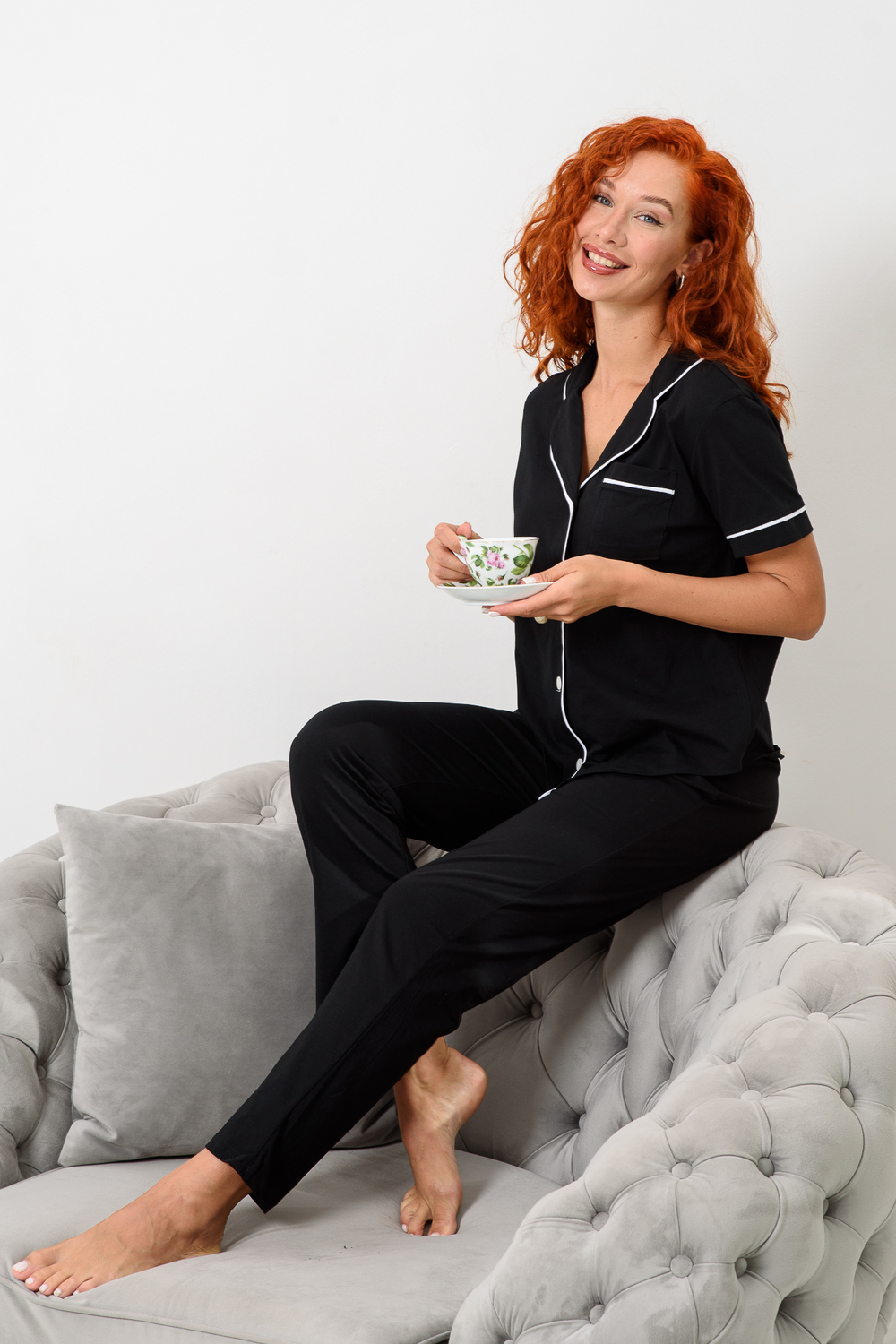 Уютный пижамный комплект это то, что Вам нужно, для комфортного ночного сна и вечернего отдыха! Домашний костюм из новой коллекции нашего бренда включает рубашку на пуговицах и штаны с высокой посадкой. Вещи сшиты из приятной к телу и хорошо дышащей хлопковой ткани. Они имеют прямой свободный крой, благодаря чему не стесняют движений и не доставляют дискомфорта. Рубашка с длинными рукавами и отложным воротником дополнена карманом на груди. Она отлично сочетается с брюками на эластичной резинке. Красивая и удобная пижамка подойдет взрослым женщинам и молодым девушкам. Это универсальный спальный комплект, который станет базовым в домашнем гардеробе девочек подростков.