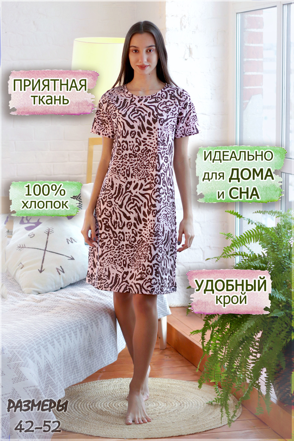 Сорочка женская розового цвета, с коротким рукавом и вшивной круглой горловиной. Данная модель хорошо подойдет для дома и сна.