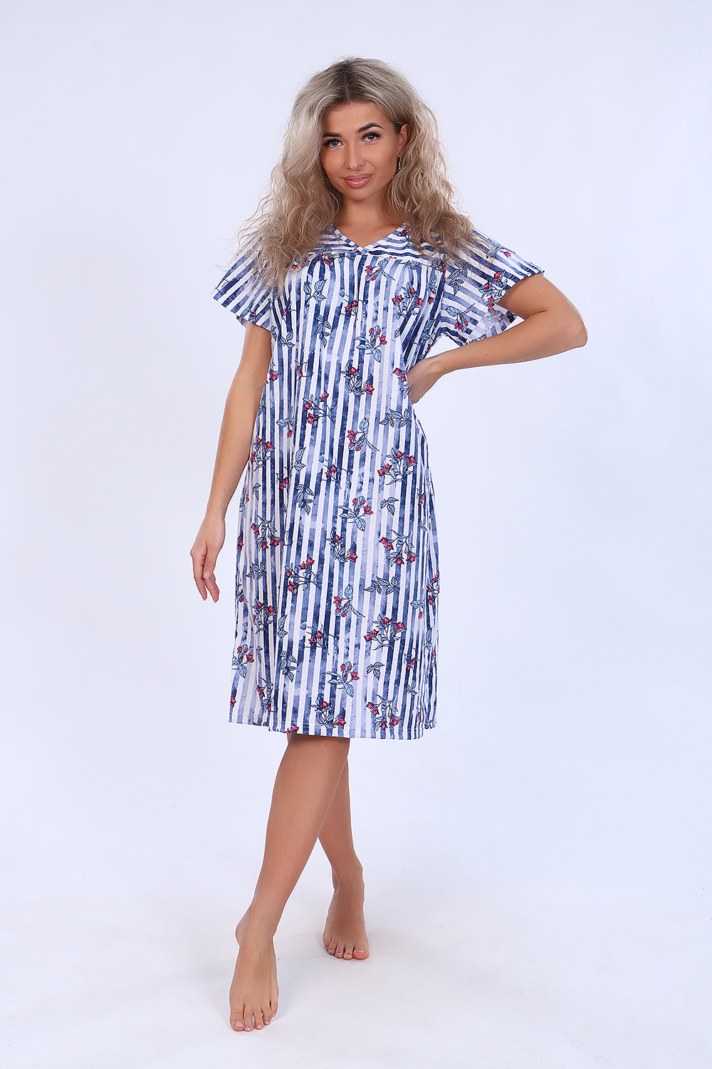 Сорочка свободного кроя с отрезной кокеткой. По линии груди заложено по три складки с каждой стороны. Короткие рукава крылышки. Необходимый элемент домашнего гардероба. Комфортна для повседневной носки и сна. Рост модели на фото 165см, размер 44