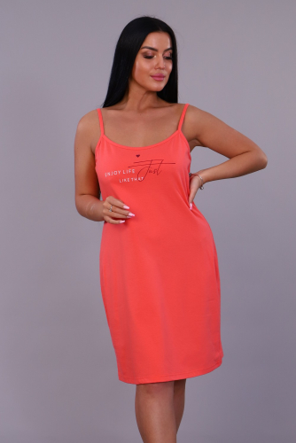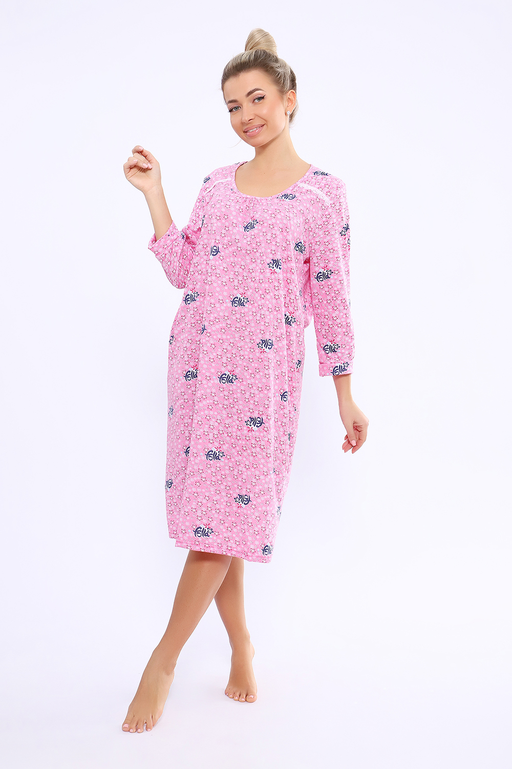 Сорочка женская трикотажная с рукавом 3/4. Цветочный орнамент на ярко-розовом фоне, отделка кружевом.