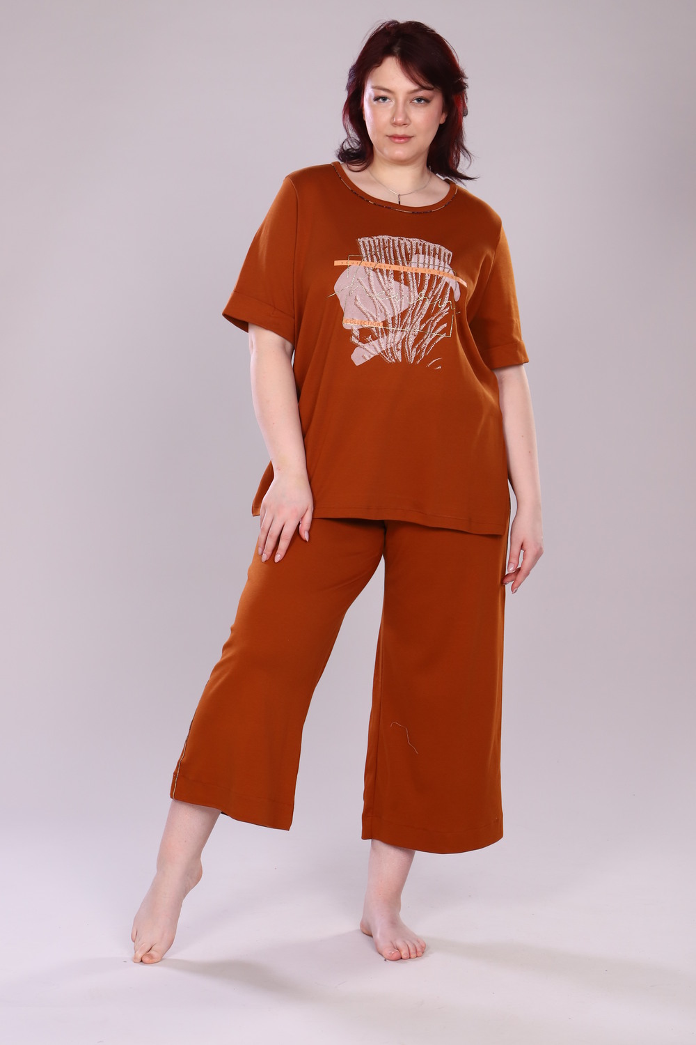 Пижама женская с широкими брюками и свободной удлиненной футболкой с разрезами по бокам.