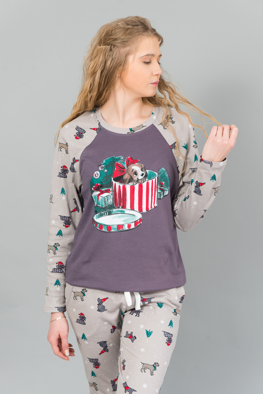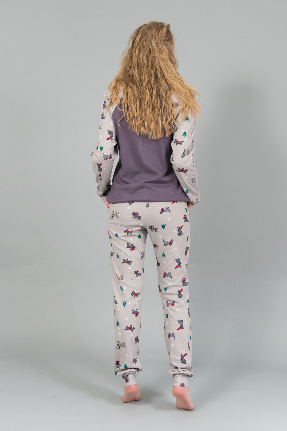 Уютная женская пижама с брюками и кофтой из полуприлегающего кроя. Дизайн позволяет использовать данную модель как пижаму для сна, так и в качестве костюма для дома. Модель выполнена из высококачественного интерлока. Цвет: серый;коричневый; Материал: интерлок;интерлок; Состав: 100%хлопок.