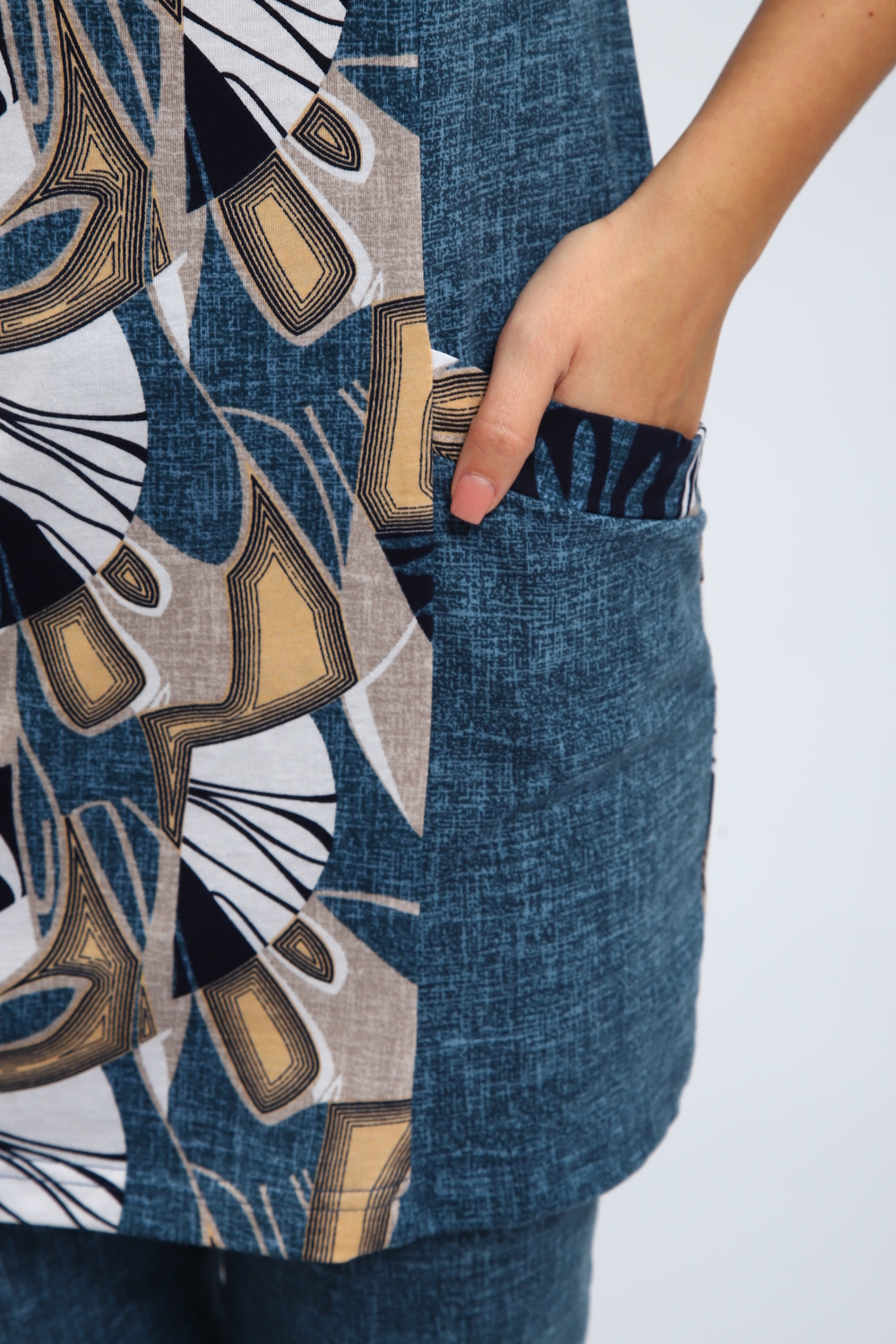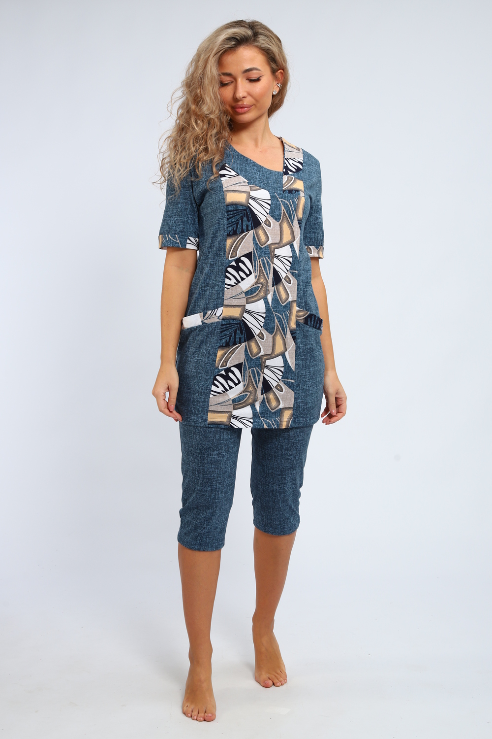 Женский костюм выполнен из мягкого хлопка, поэтому в нем комфортно в любое время года. Такой трикотажный костюм легко использовать как повседневный наряд для дома. Фасон продуман до мелочей: удобный крой туники с карманами и коротким рукавом отлично подходит как летний вариант, а в прохладное время костюм можно носить как демисезонный. Для полных женщин костюм станет удачным решением: эластичный материал хорошо садится на фигуру и не сковывает движений, долго сохраняет аккуратный вид, не вытягивается и остаётся привлекательным даже при длительном использовании. Благодаря мягкой ткани и свободному крою в нем удобно отдыхать дома Цвет: серо-голубой; Материал: кулирка;кулирка; Состав: 100% хлопок.