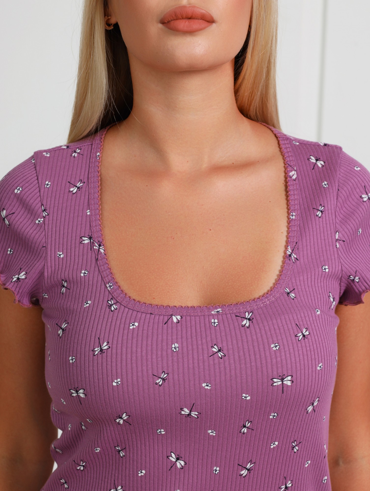 Сорочка молодежная из трикотажного полотна «кашкорсе» с набивным рисунком, слегка расширенная книзу, с короткими втачными рукавами, углубленной формой горловины, окантованной основным материалом и украшенной декоративной строчкой «кроше». Низ изделия и нижние срезы рукавов обработаны узкой обметочной строчкой, создающей красивый волнистый край.