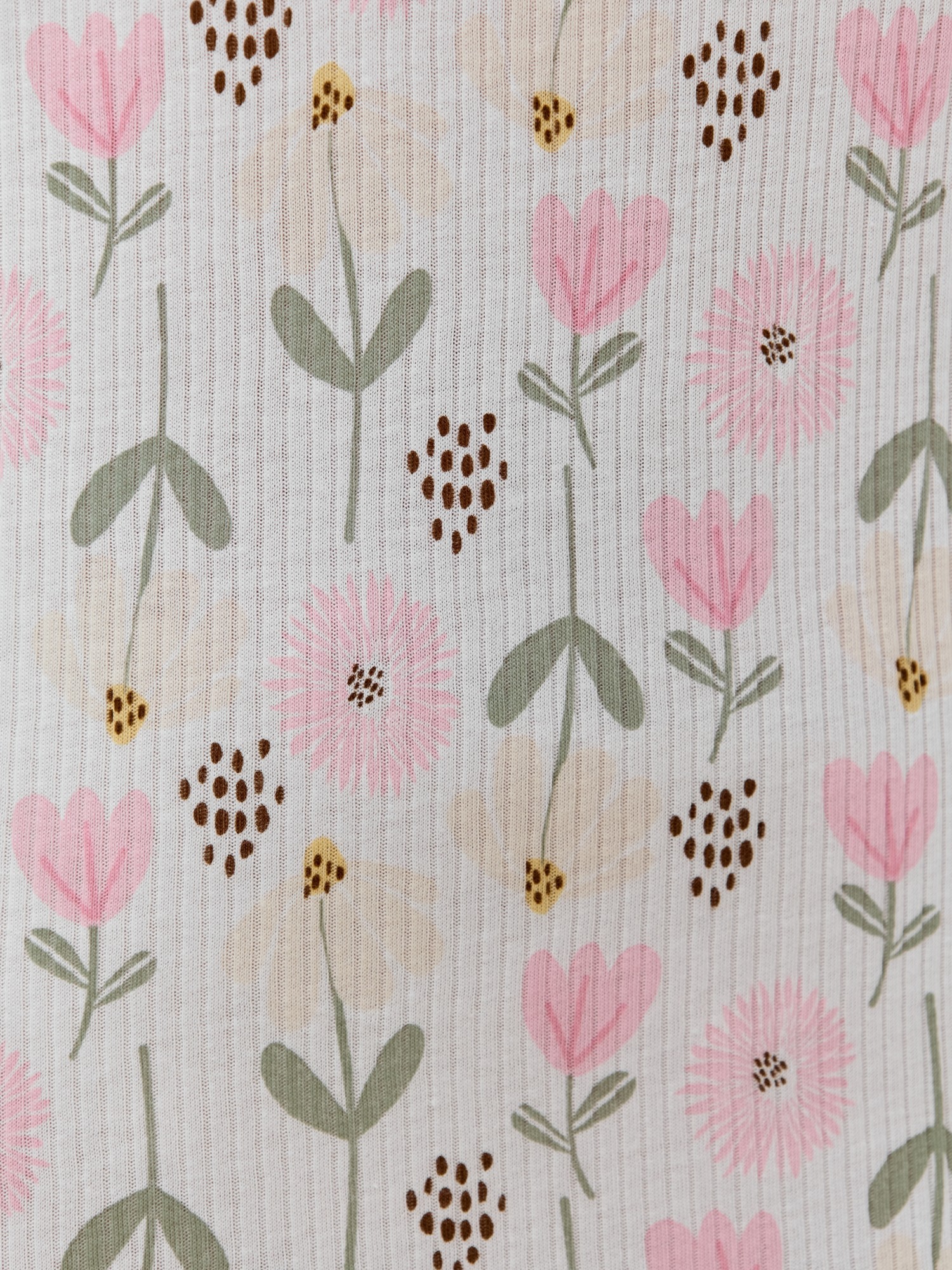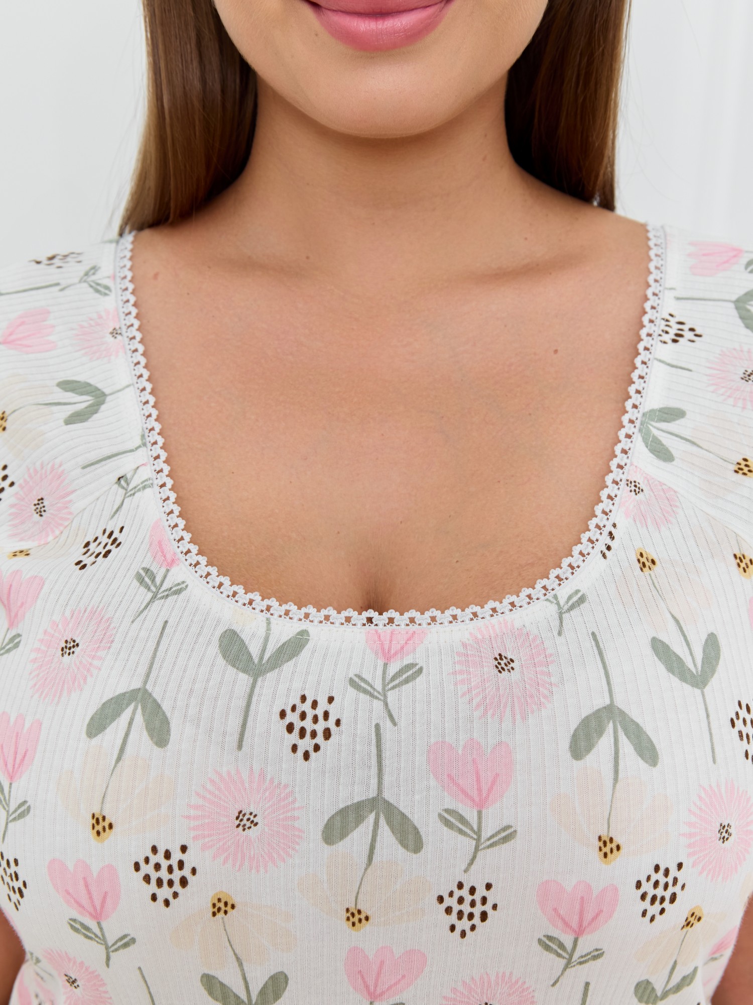Сорочка женская из трикотажного полотна «кашкорсе» с набивным рисунком, слегка расширенная книзу, с короткими втачными рукавами, углубленной формой горловины. Низ изделия и нижние срезы рукавов обработаны эластичной тесьмой с фасонным краем.