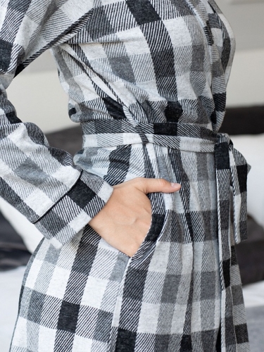 Женский домашний халат из мягкого трикотажа с лёгким ворсом, с принтом в крупную клетку. Практичная модель дарит тепло и уют, а расцветка рисунка ткани от светло- до темно-серого способствует умиротворению и релаксу. Халат на запАх, универсальной длины миди. Внутренняя полочка фиксируется завязкой из тесьмы. Мягкий пояс можно завязать бантом. В боковых швах – карманы. Рукава оторочены манжетами с тонким кантиком. Классический узор ткани, напоминающий легендарную клетку Гленчек, никогда не выйдет из моды. Состав: 88% полиамид, 10% вискоза, 2% спандекс