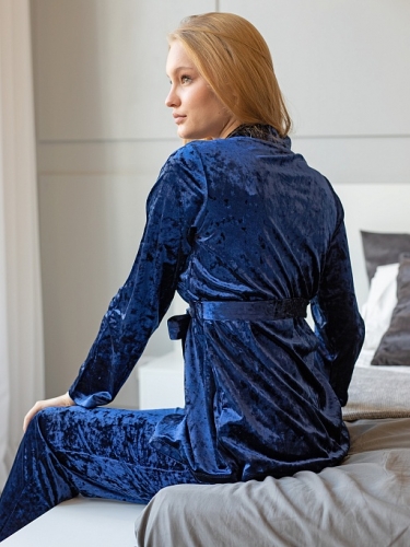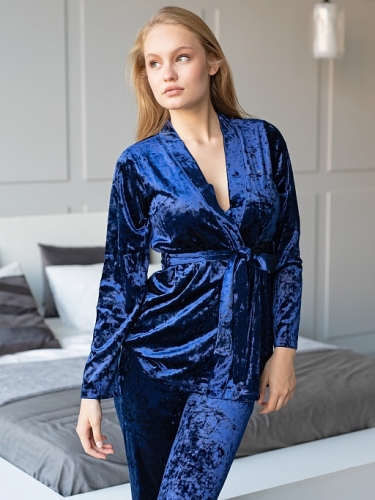 Женский домашний костюм из бархатного велюра благородного и аристократичного темно-синего цвета. В нем Вы всегда будете на высоте, даже перед неожиданными гостями. Лаконичный крой без лишних деталей – вечная классика, которая никогда не надоест. Прямые брюки в пол с удобными боковыми карманами и широким комфортным поясом. Жакет на запАх, с прямыми рукавами. Внутренняя полочка поддерживается завязкой из тесьмы, а внешняя – широким мягким поясом. Переливы бархатной ткани выглядят роскошно. Состав: 95% полиэстер, 5% спандекс
