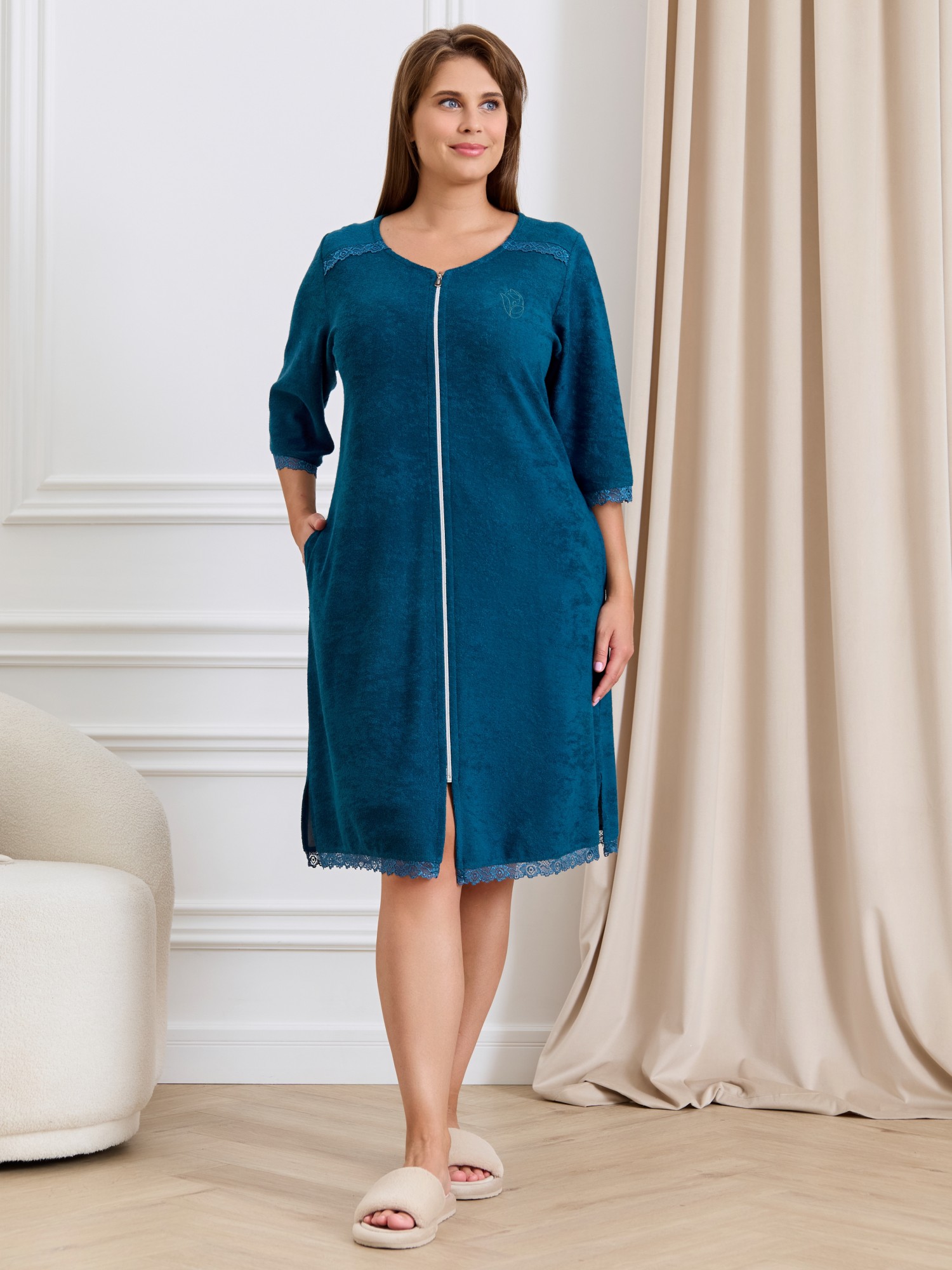 Халат женский из гладкокрашенного трикотажного махрового полотна, прямого силуэта, с горловиной овальной формы, втачными рукавами длиной ¾ длины, карманами в боковых швах и центральной бортовой застежкой на тесьму «молния». Полочка – с двумя небольшими косыми кокетками с кружевом в швах соединения кокеток с основными деталями, на левой полочке выполнена вышивка. Нижние срезы рукавов и нижние срезы изделия обработаны кружевом, в боковых швах разрезы.