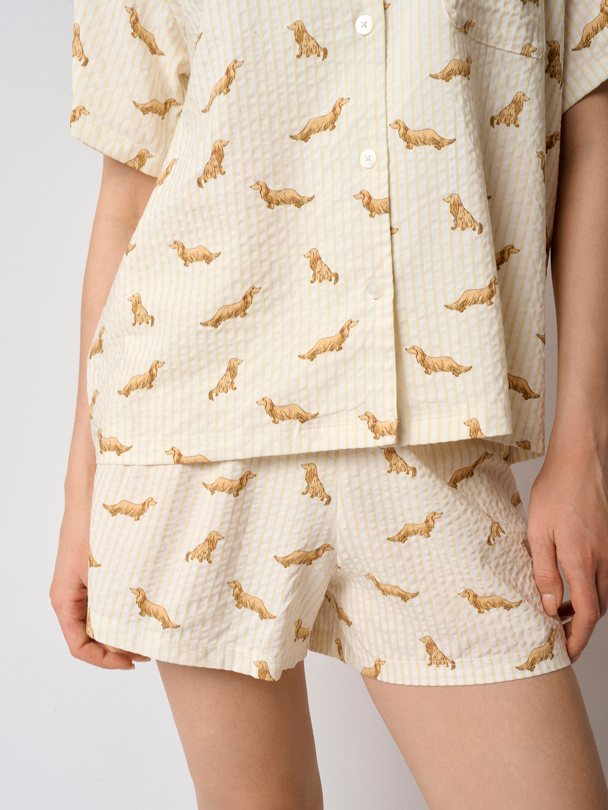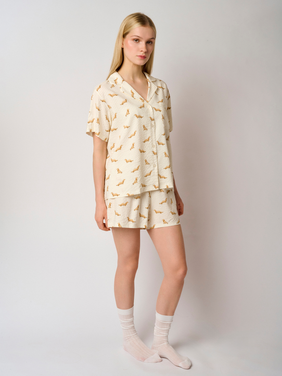 Пижама в молочном оттенке с принтом. Сшита из нежной к коже вискозе и дышащего хлопка, подходит для любого времени года. Рубашка прямого кроя с пуговицами в тон и аккуратным нагрудным карманом. Шорты с плотной эластичной резинкой.