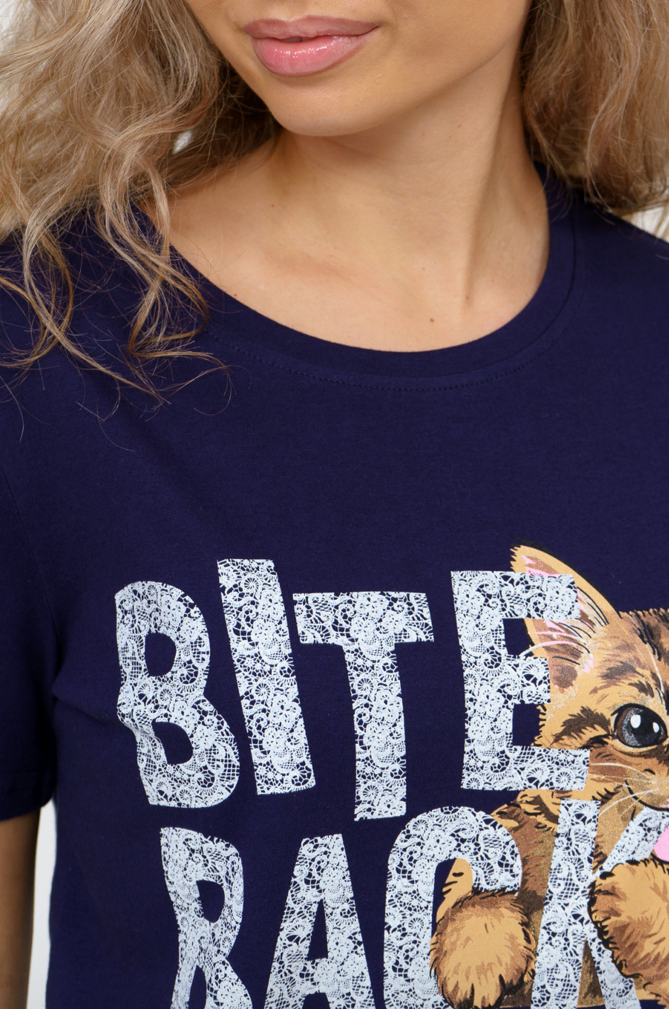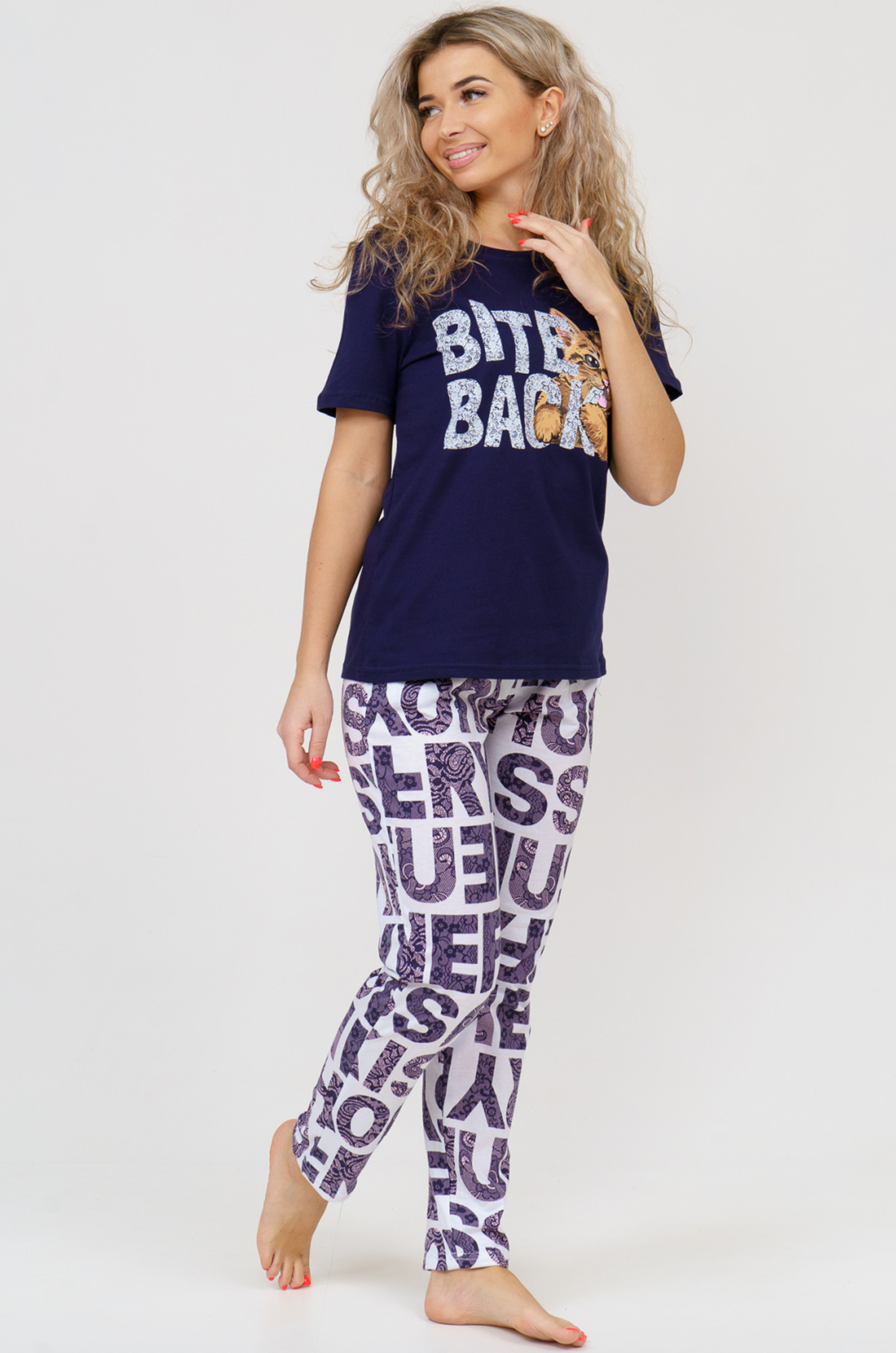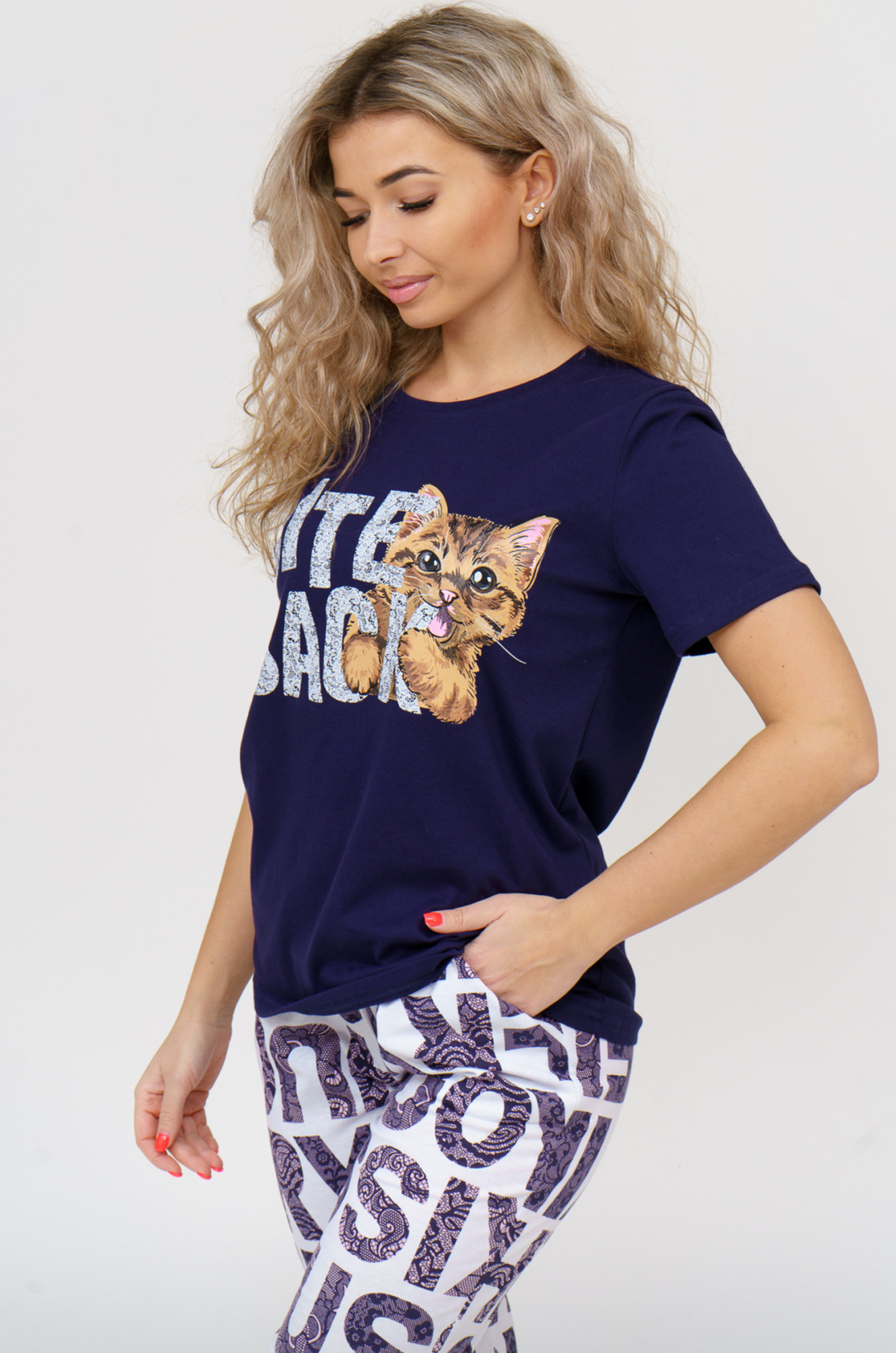 Пижамка с футболкой и брюками. Футболка прилегающего силуэта со спущенным плечом и коротким рукавом, на полочке печатный принт. Брюки прямые, чуть заужены к низу, пояс на резинке, внутренние карманы.