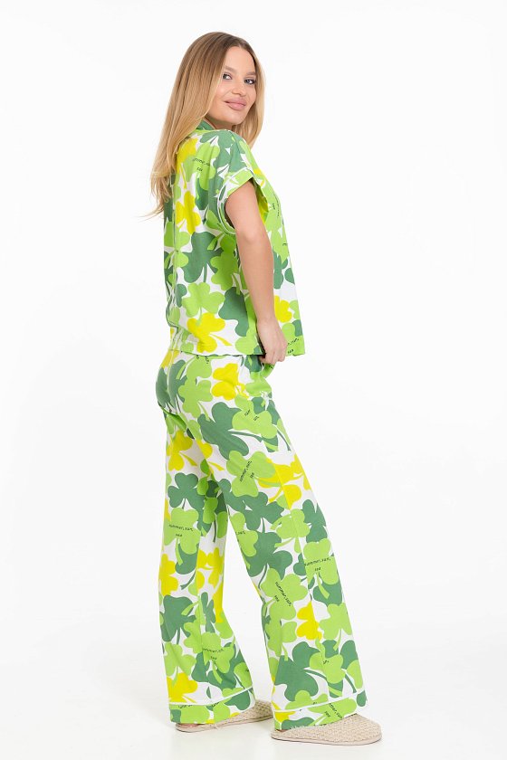 Женская пижама - рубашка и брюки, изготовлена из мягкой и приятной к телу ткани — кулирки с набивным рисунком. Рубашка свободного силуэта с цельнокроеным коротким рукавом и застёжкой на пуговицах обеспечивает свободу движений. Отложной воротник и накладной карман на полочке придают изделию оригинальность. Брюки чуть расширенные к низу, с широким поясом на резинке обеспечивают комфортную посадку. Манжеты на рукавах, брюках и верхней части кармана с кантом белого цвета, добавляют изюминку и индивидуальность вашему образу. Изготовленная из натуральной ткани, пижама обеспечит комфорт в течение всего дня.