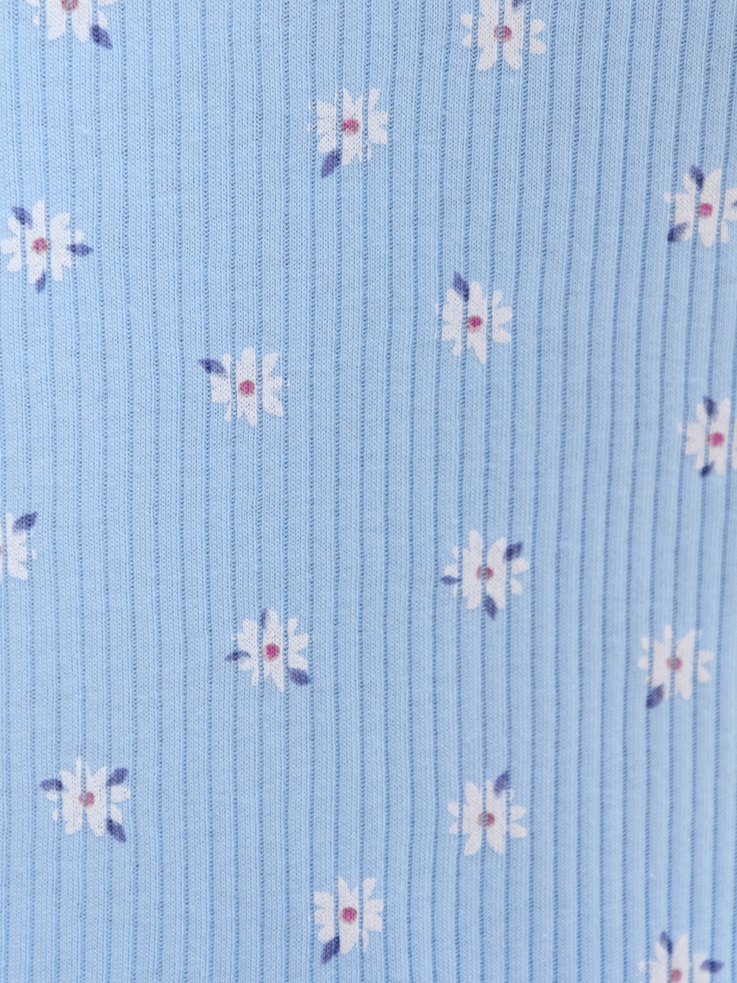 Пижама женская из трикотажного полотна «кашкорсе» с набивным рисунком, состоящая из футболки и брюк.Футболка - классического покроя с углубленной формой горловины, обработанной эластичной тесьмой с фасонным краем и цельнокроеными рукавами.Брюки – длинные, свободные, с эластичной тесьмой по талии.