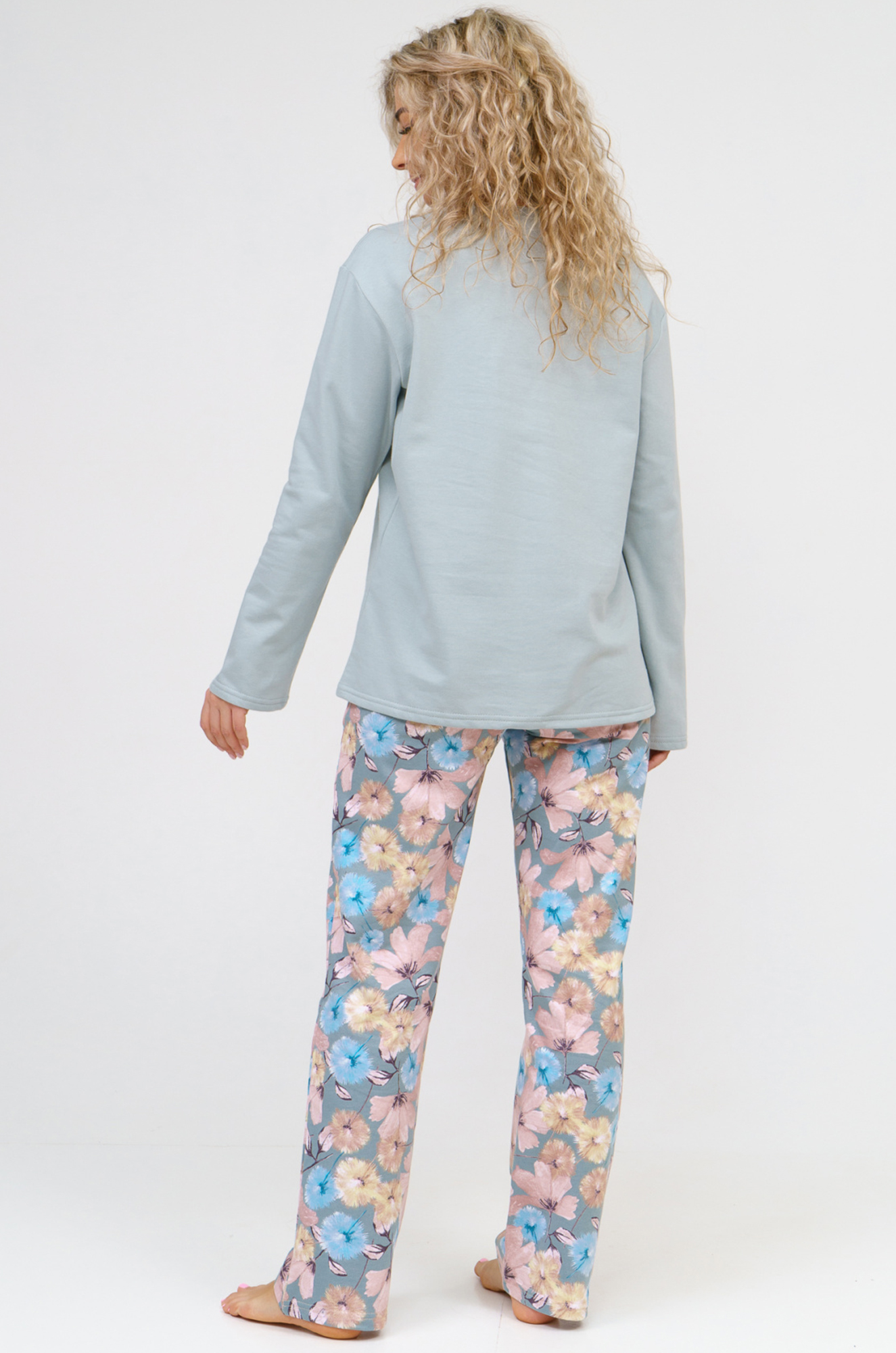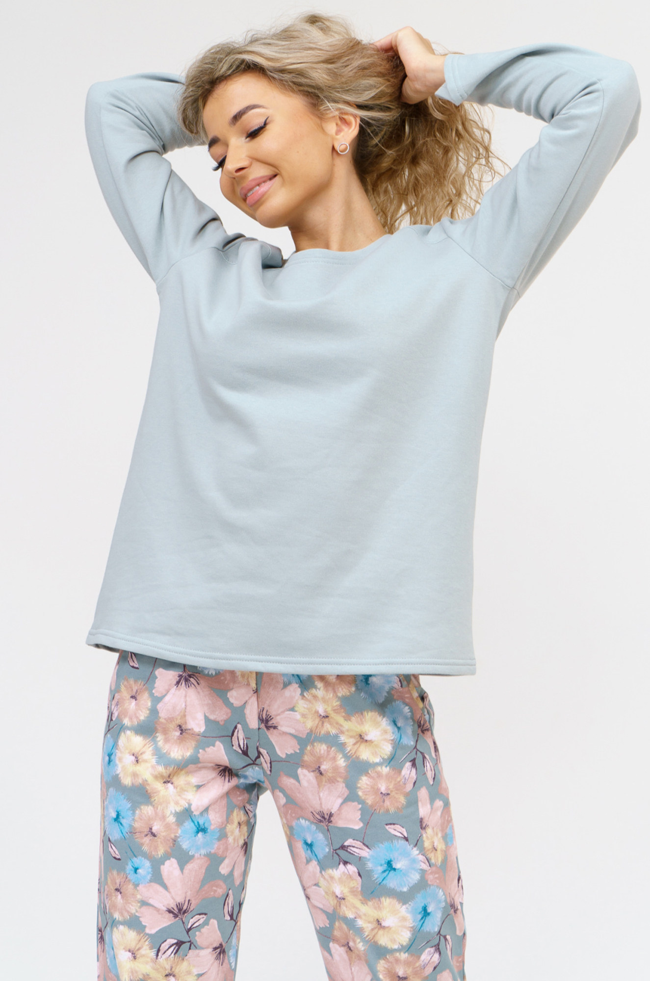 Тем, кто ценит домашний комфорт и уют, несомненно понравится эта пижама! Симпатичная хлопковая модель смотрится очень мило. Однотонная кофта с длинными рукавами, кокетка на полочке в области плеча. Брючки прямые, с боковыми карманами, пояс на широкой резинке.