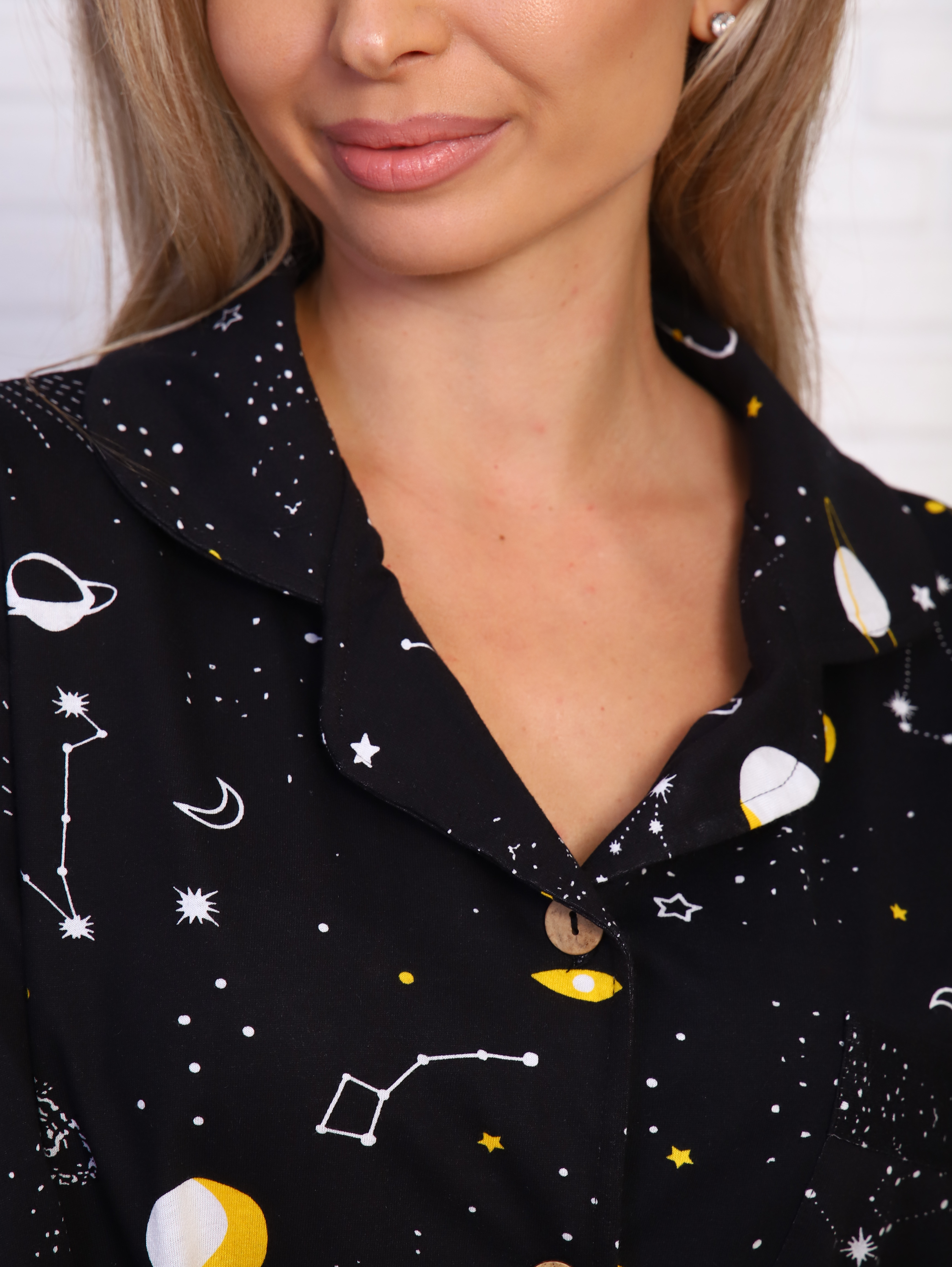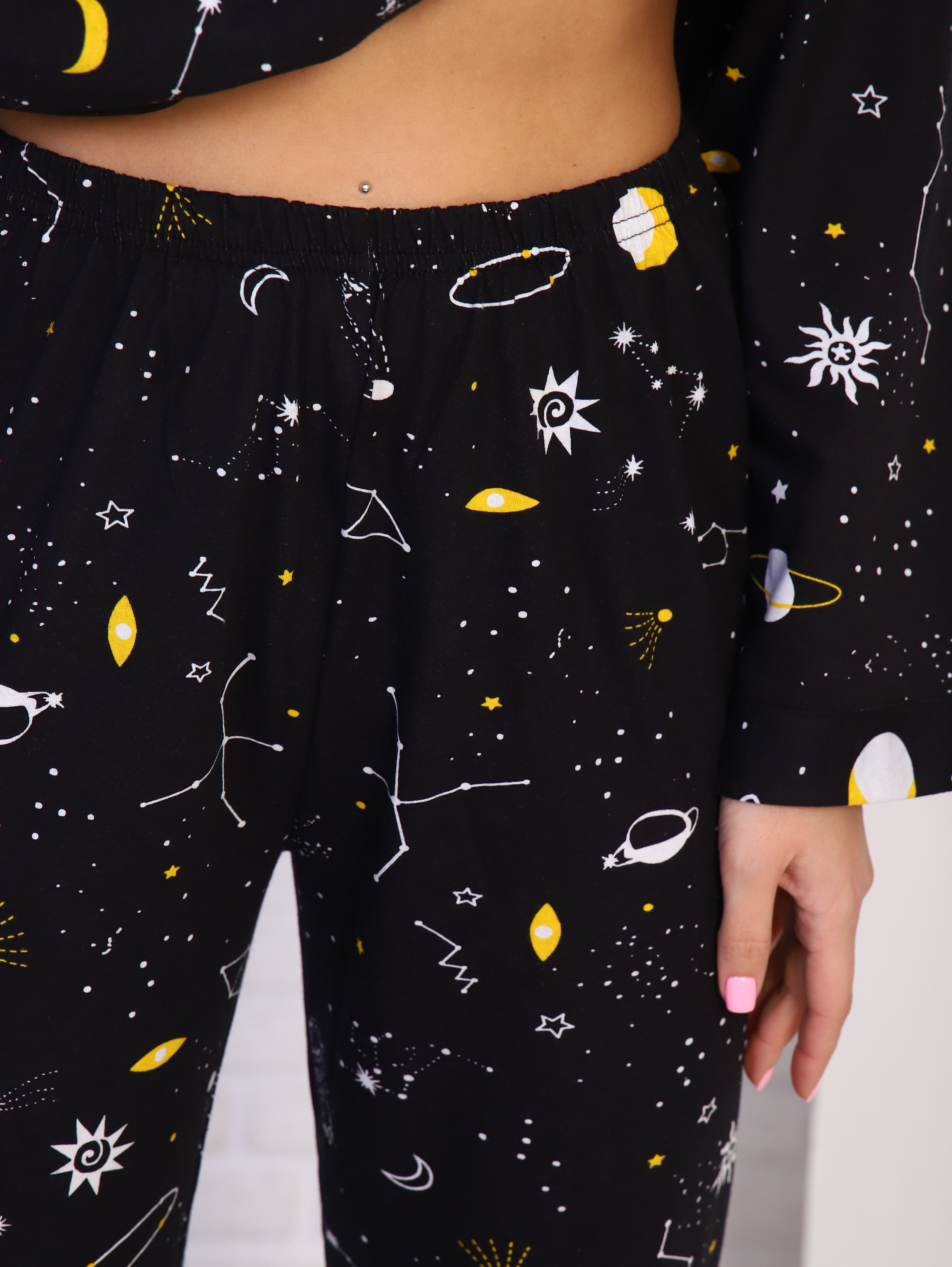 Удобная и комфортная хлопковая пижама оригинальной расцветки. Кофта прямого кроя на пуговицах, на груди накладной карман, воротник отложной. Брюки прямые, по низу манжеты, пояс на резинке. Ткань кулирка.
