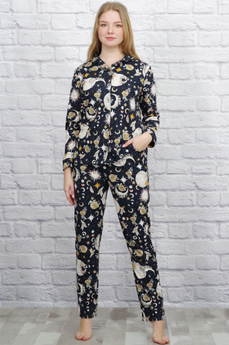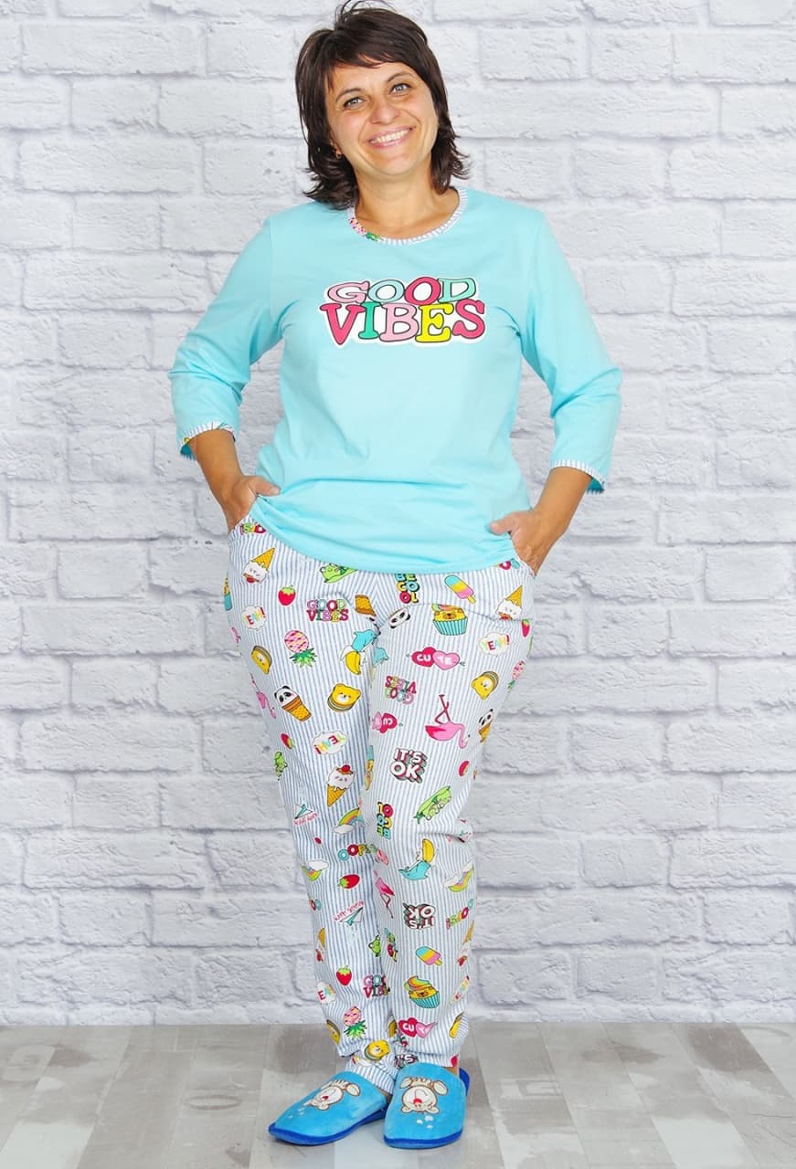 Футболка с рукавом 3/4 и с окантовкой в цвет брюк, На полочке печатный принт.
