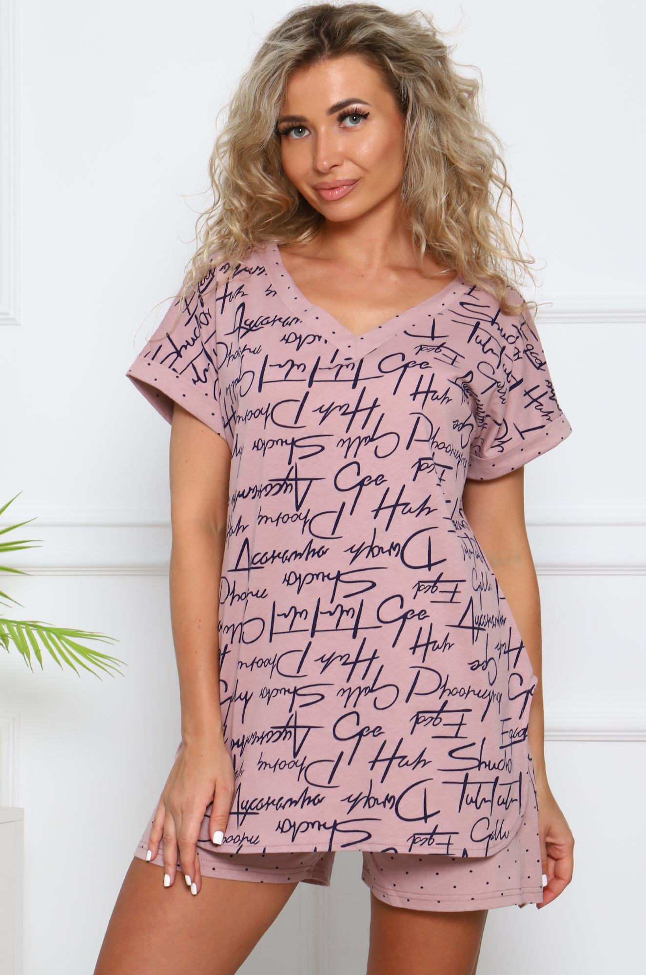 Женский хлопковый костюм-пижама с шортами подойдёт и для сна, и для отдыха. Футболка длинённая с закругленным низом, свободного кроя, с цельнокроеным рукавом на манжетах. Глубокий вырез "галочкой" подчеркнёт зону декольте и сделает образ привлекательным и женственным. Шорты на широкой резинке с боковыми карманами.