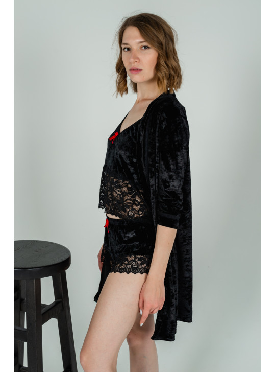 Пижама женская. Благородный бархат в сочетании с широким эластичным кружевом и декоративными бантиками.