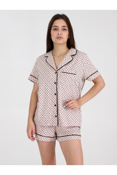 Элегантная пижама костюмного типа с шортами. Рубашка с коротким рукавом, кармашком на груди, "английским" воротником, хлопковый кант. Шорты с поясом-резинкой, двумя внутренними карманами.