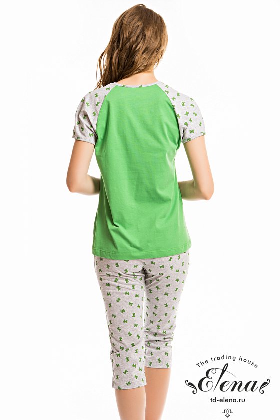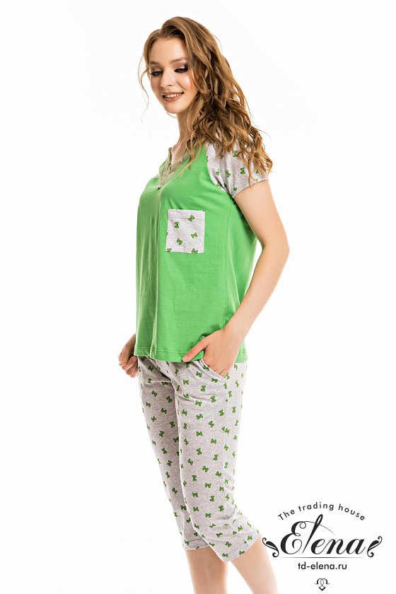Комплект выполнен из кулирки, состоит из капри и футболки. Рукава футболки покроя реглан, горловина V-образная, оформлена эластичным кружевом. На груди расположен небольшой карман. Капри с карманами по бокам.