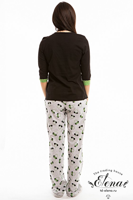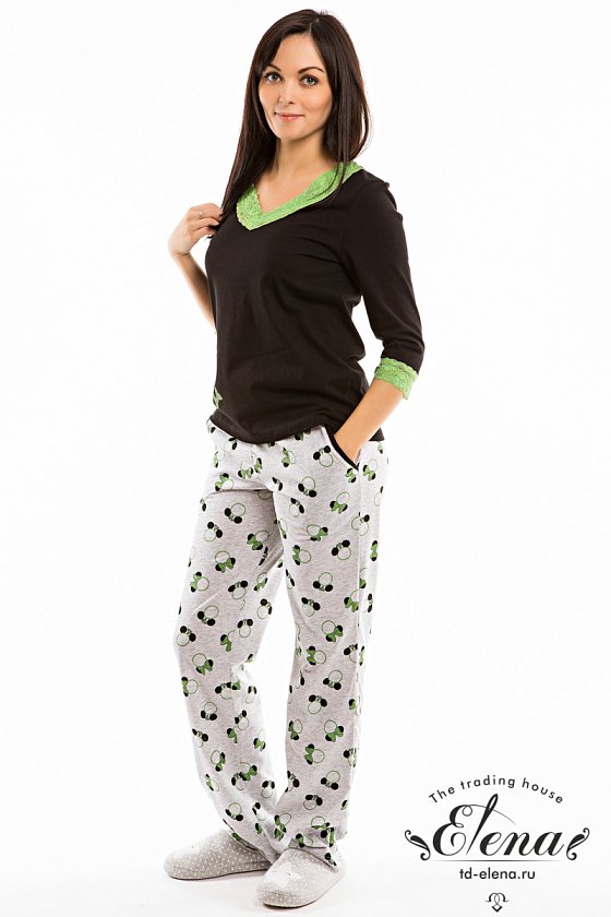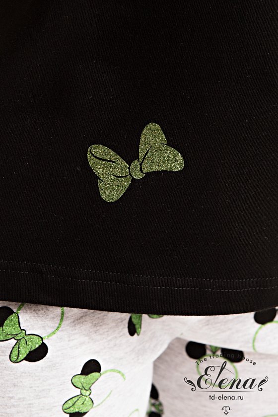 Комплект состоит из брюк и футболки с рукавом 3/4. Брюки из кулирки, с боковыми карманами и поясом на резинке. Посередине пояса декоративный бант в цвет футболки и канта карманов. Футболка с термопринтом и V-образным вырезом, по краю которого пришито кружево, также отделка кружевом по низу рукавов.