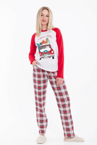 Комплект выполнен из кулирки с набивным рисунком с отделкой из однотонного полотна. Рубашка с отложным воротником и бортами, с рукавом длиной 3/4 и разрезами в боковых швах. Воротник, борта и манжеты рукавов из отделочного полотна. Спереди застёжка на пуговицы. Брюки с боковыми карманами, притачным поясом и отделочными манжетами.