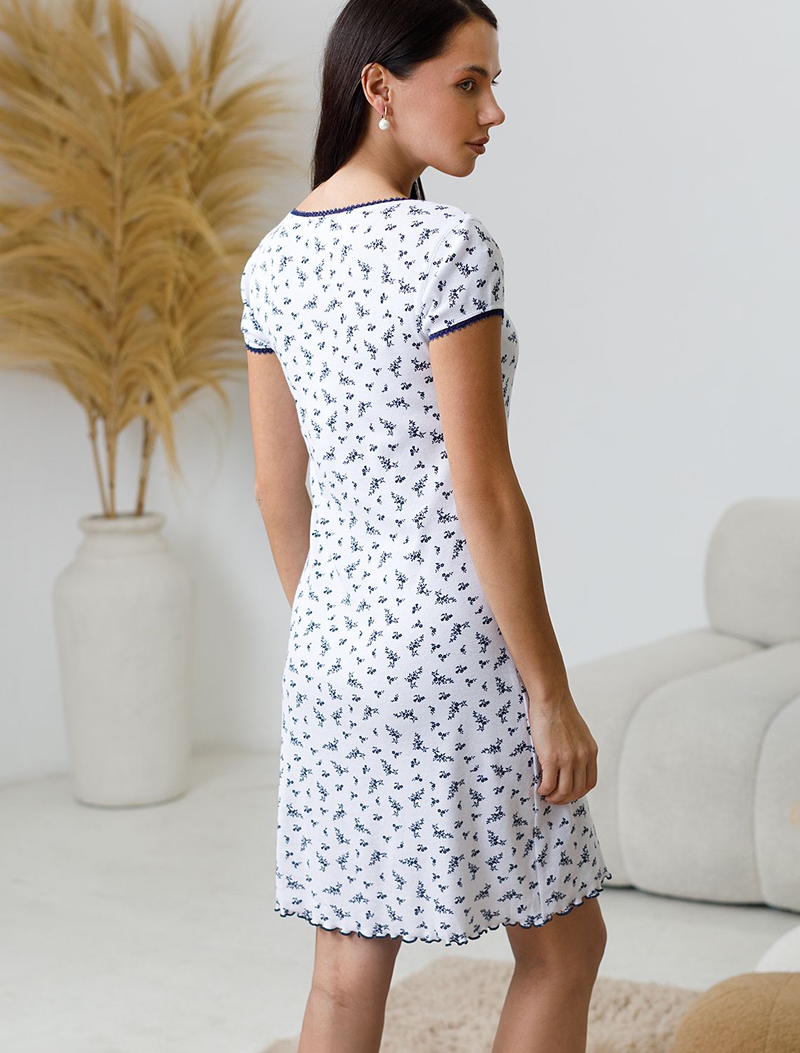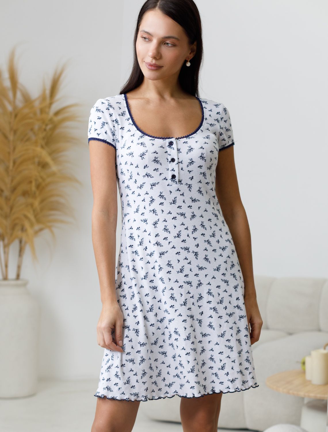 Платье белого цвета длины мини c U-вырезом из фактурного трикотажа в рубчик создано для современных женщин, ценящих красоту и удобство. Особенность полотна - трикотаж кашкорсе удивительной мягкости, намного мягче стандартных вариантов, подходящий для расслабленных домашних и пижамных образов. Хлопок обеспечивает максимальный комфорт даже в течение длительного времени и позволяет коже дышать, а эластан в составе позволяет ткани подстраиваться под особенности фигуры и помогает сохранить форму даже после долгой носки. Крой выгодно подчеркивает фигуру и создает женственное настроение в образе. Благодаря отделке нежным кружевом и цветочным принтом платье выглядит по-особенному романтично и изысканно. Это красивое платье подойдет для домашних встреч с друзьями или спокойного вечера в кругу семьи. Мягкая ткань трикотажа приятна на ощупь и создает ощущение уюта. Дополнительной деталью становятся пуговицы, придающие платью лаконичность и интересный акцент. Такое милое короткое платье идеально смотрится на разных типах фигуры благодаря представленной широкой размерной линейке. Универсальное платье гармонично впишется в гардероб, подчеркнет индивидуальность и создаст хорошее настроение дома.